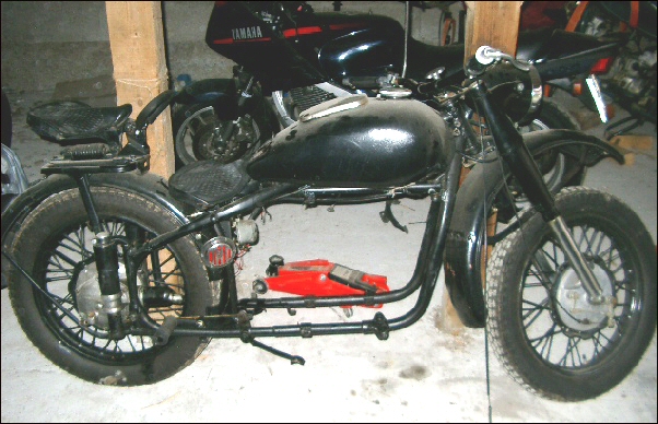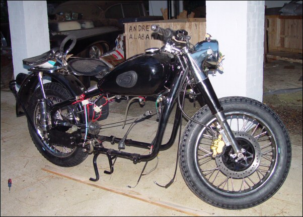 He's having to replace it with one from an M72. Is that crazy or what? Here's the bike prior to the surgery. It has an earles fork and one of those famous Russian bottle cap hubs as well. | ||||