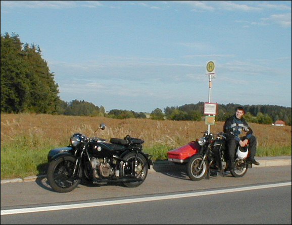 Georg and his pal Bodo took their sidecars to the big MZ meet in Zschopau. That's Bodo with his TS-250 as they stopped for their first break along the way. | ||||