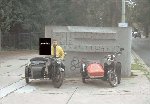 This is pretty cool. It's a monument to socialism in Chemnitz. Obviously we're in former East Germany. By the way, Bodo censored the picture because Georg is doing a Rotfrontgruss (Red Front) salute which is verboten. | ||||