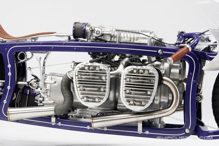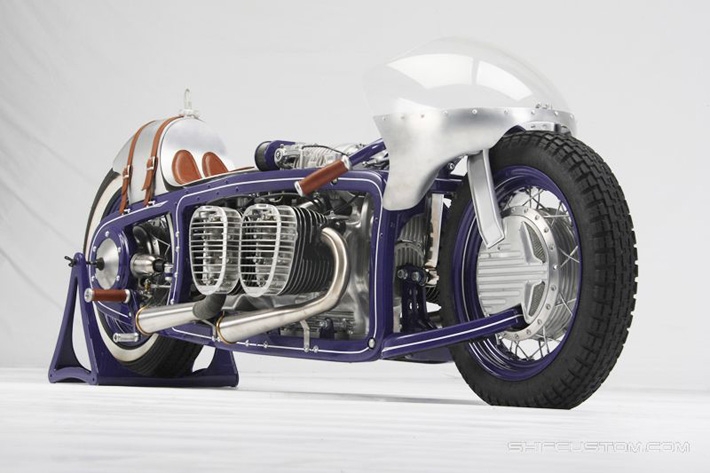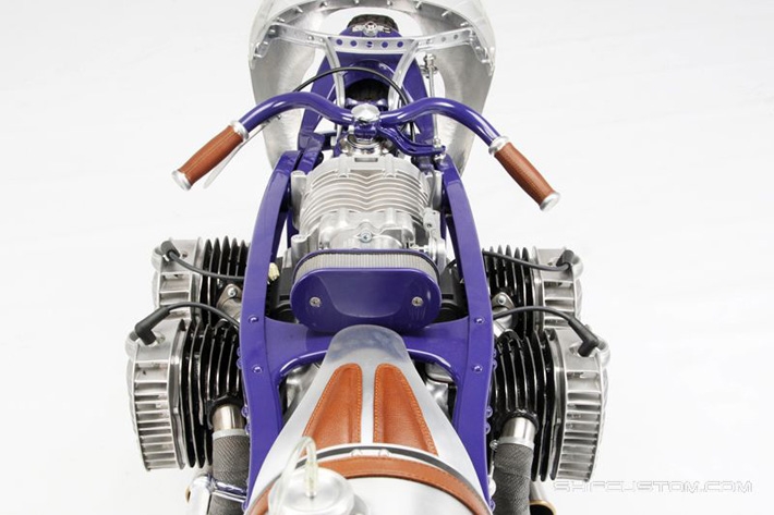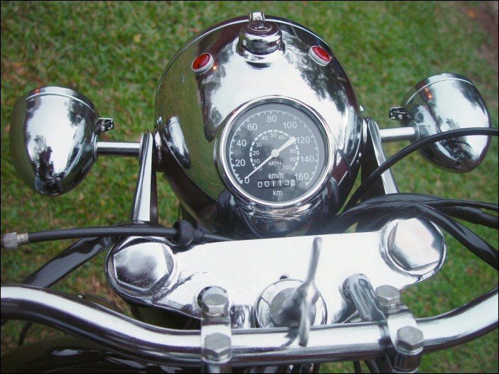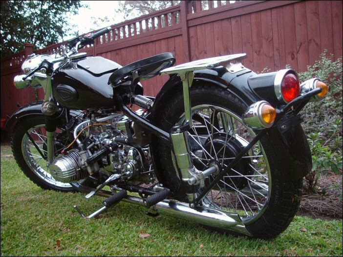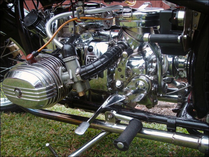 ...but from this side you can see it's not. That's a 1952 BMW R67/2 engine and yes, this is one of Jim Bryant's creations. Doug's added a few featuresnew BMW exhaust headers, BMW headlight-mounted mirrors, Bosch 6V hard-case battery, taillights and a halogen headlamp. Aside from those items, all Doug has had to do is perform basic maintenance. | ||||