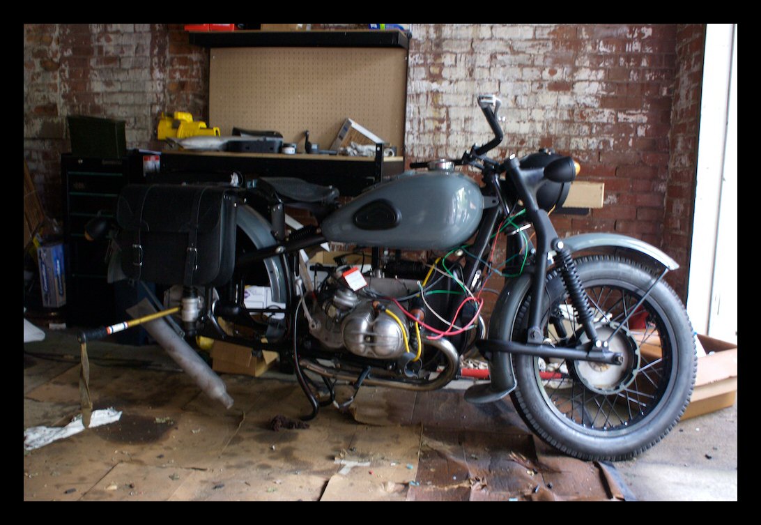 Next to come is a set of birdtail mufflers, completely new BMW wiring harness, an R67 headlight with BMW ignition switch and black plastic key, and a mechanical headlight dimmer/horn switch (cable-operating a high/low dimmer in the headlight shell.) Very cool. | ||||