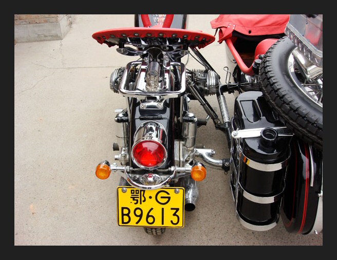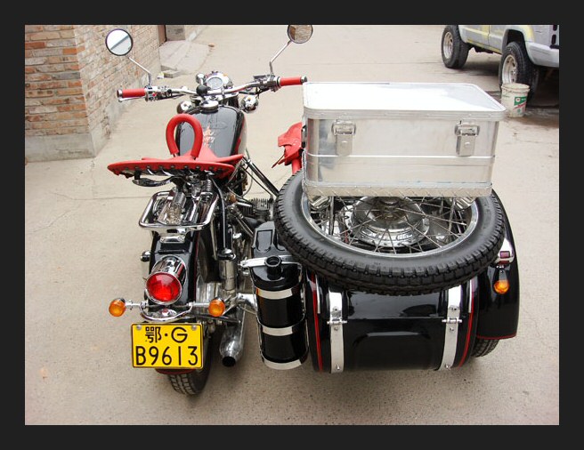 A water cooled sidecar rig outside. The enlarged image shows another water cooled Chang parked behind it, albeit a more modern looking one. | ||||
