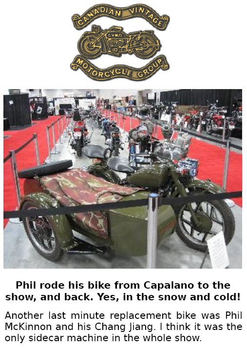 On January 2, 2011, Rejean Gagnon suffered a stroke which he thinks marks the end of his riding days. (Hopefully not.) This left a vacancy at the bike show put on by the Northern Alberta Chapter, Canadian Vintage Motorcycle Group. Our friend Phil McKinnon filled the slot with his CJ, riding in -26ºC weather to attend. (For all you Yanks, that's -15ºF!) | ||||