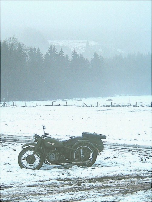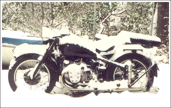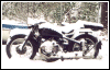 If you stay warm and dry, snow riding is a hoot. Here's Jean's M1M waiting for someone to take it for a spin. | ||||