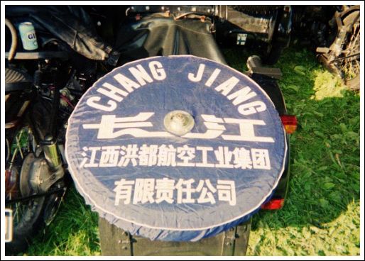 Look at this spare wheel cover! It was on one of the bikes at the recent MC Long March/Ural Roikka gathering in Finland, courtesy of Orvo Valila. The Chinese reads Chang JiangJiangxi Hongdu Aviation Group Ltd. Co. (Translation provided by Butch Walter and Simon Vallance.) | ||||