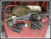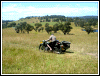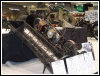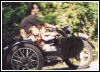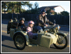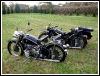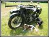 | Below is Bill's current fleet, a solo and a hack, both side valves. "The cannon is a 14th. century Moro pirate swivel gun, about 4 feet long. Still have the cannon and the dogs." | |||||