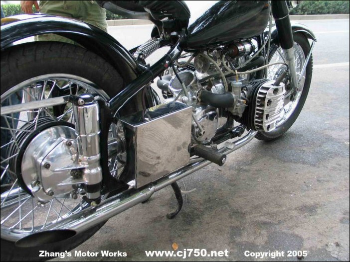 "The paint has gold ghost flames. The battery is in that chrome box on the side, and everything was triple chrome plated. The engine has a high polish as does the front rim and brake assembly. All in all it is a very very sweet ride and very fast! I also have a Kawasaki KLE400 for a daily driver. Believe me you need this on some of Beijing's roads!" | |||