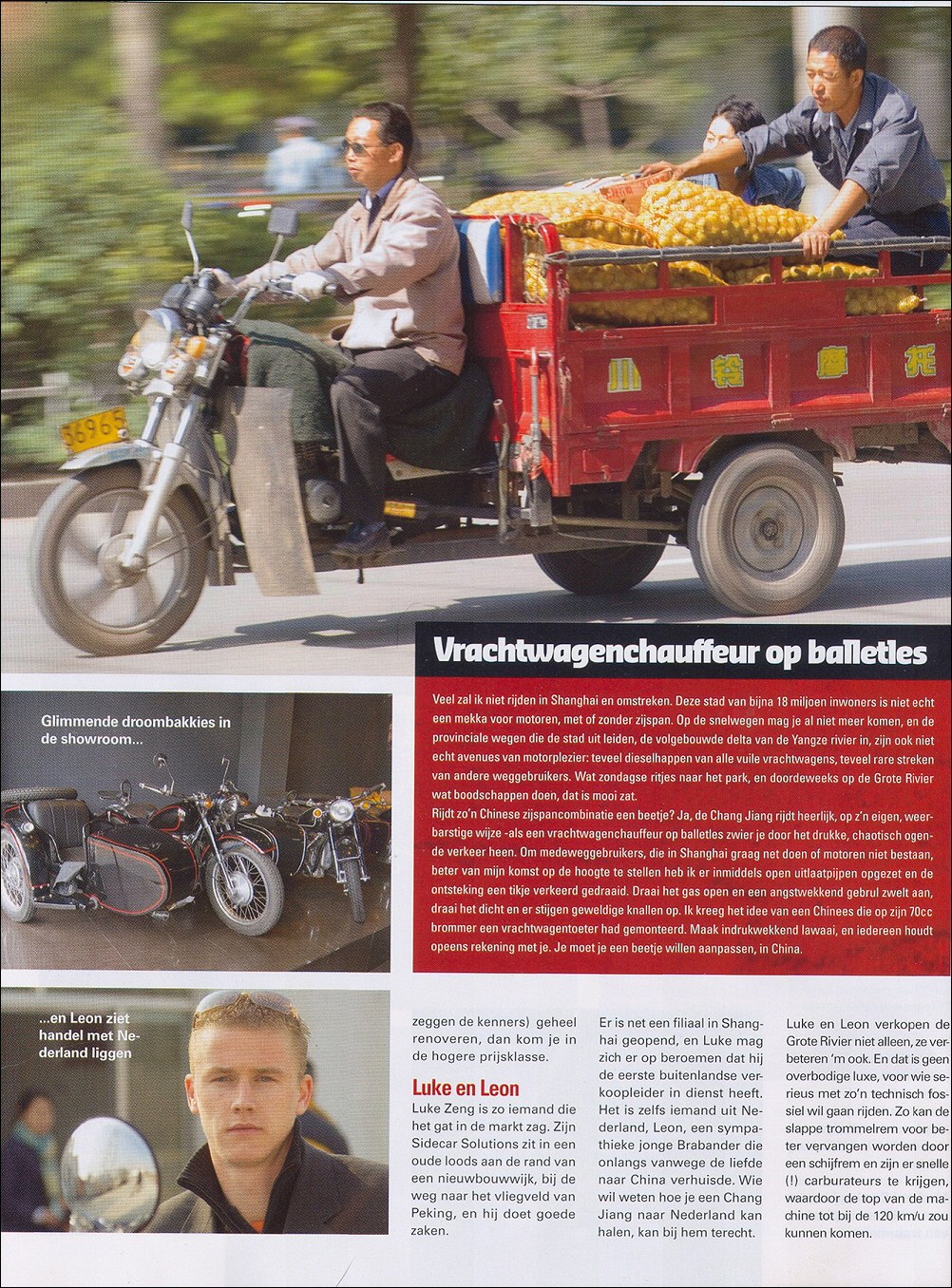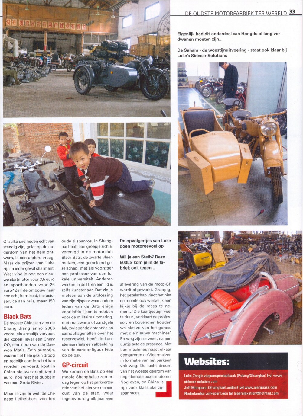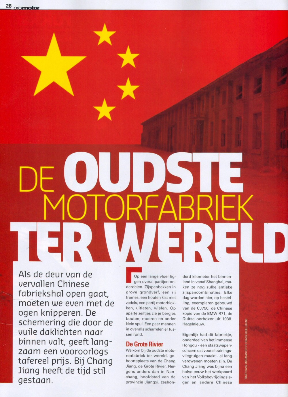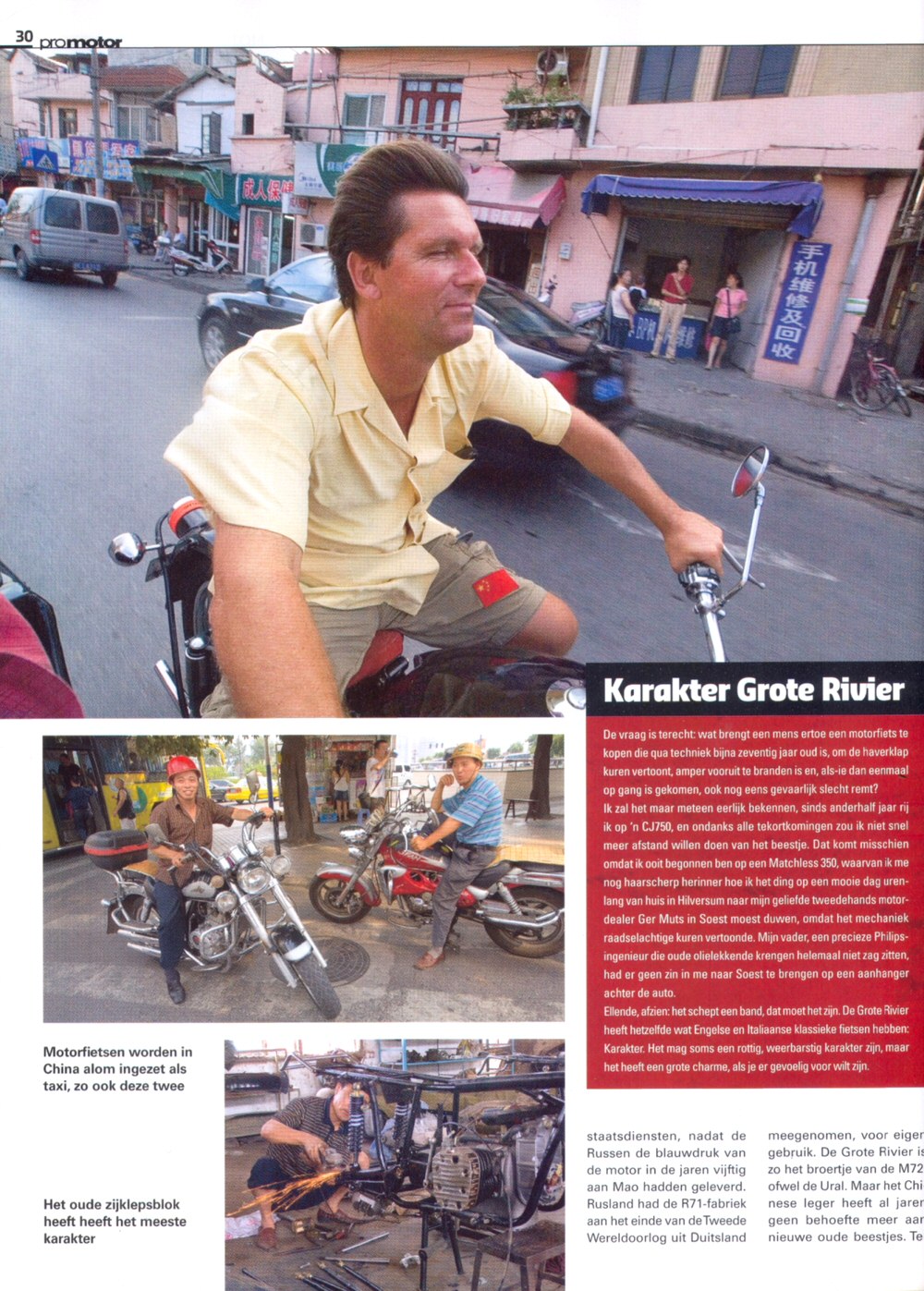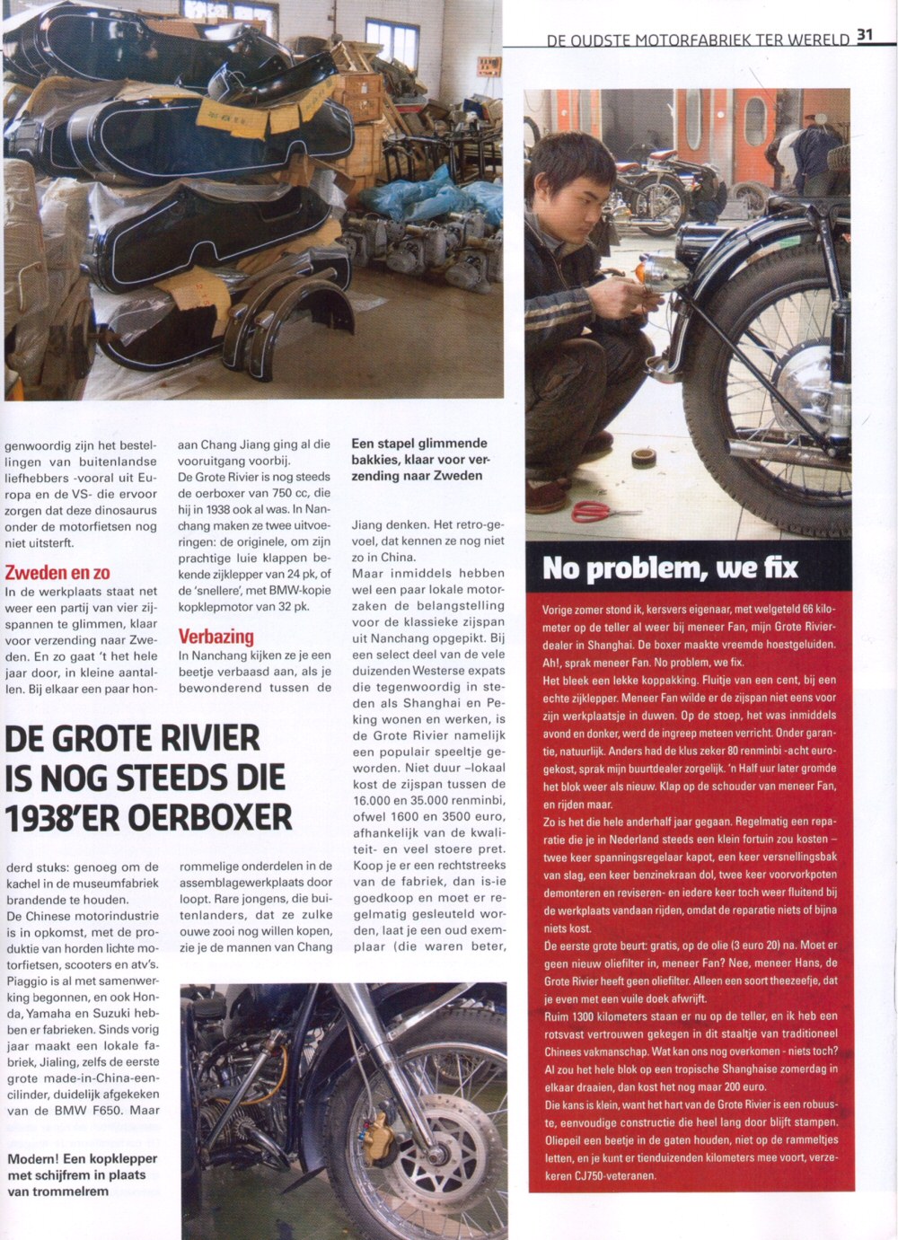 From Frans de Wit: "Here's an article from this month's Promotor, motorcycle magazine of the ANWB (the Dutch AAA). It's entitled The Oldest Motorcycle Factory in the World and was written by Hans Moleman (no, not the character from the Simpsons, but a Dutch journalist stationed in Shanghai. That's why he visits Luke's new operation.) He's also a CJ rider! The info is mostly correct except for telling the Russians took the R71 factory from the Germans AFTER WWII." | |||