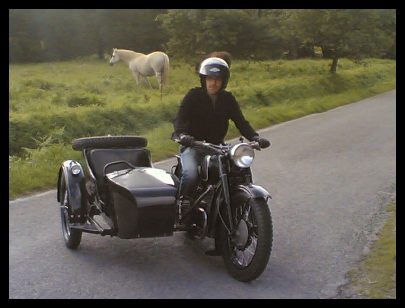 Frans de Wit of the Netherlands has been riding CJ #950006 since 1995. Here's his friend Ad Knippels during a chilly night ride. Since then Frans has added bags to the sidecar and extra lights. | ||||