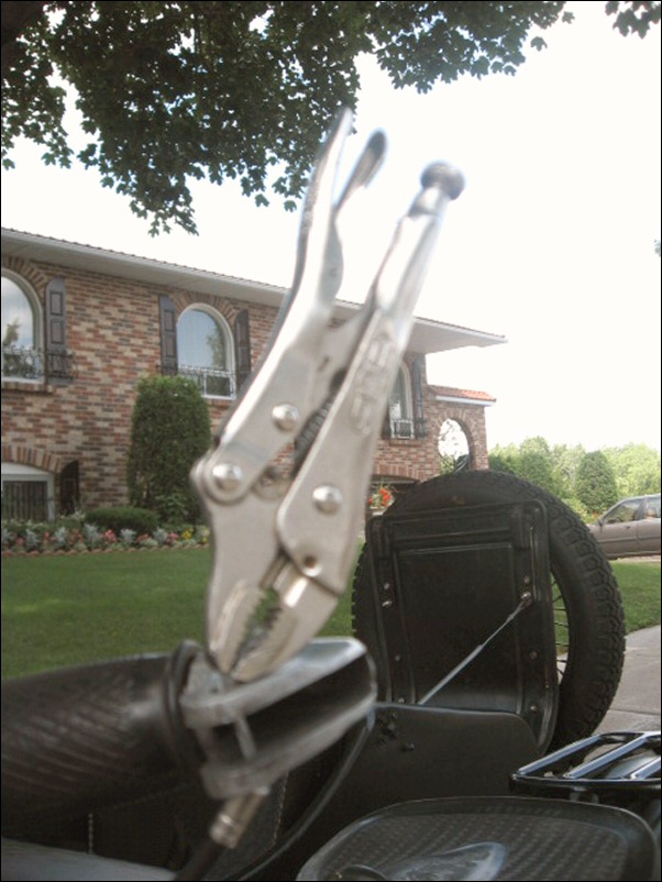 From Jean Descoteaux in Montreal: "Went for a ride with my daughter, clutch cable broke. I got home by running the cable end through the lever hole and attaching a vise-grip to it. Just pulled on the vise-grip et voila! What's that company name again? Barnett something?" | ||||