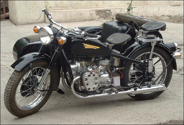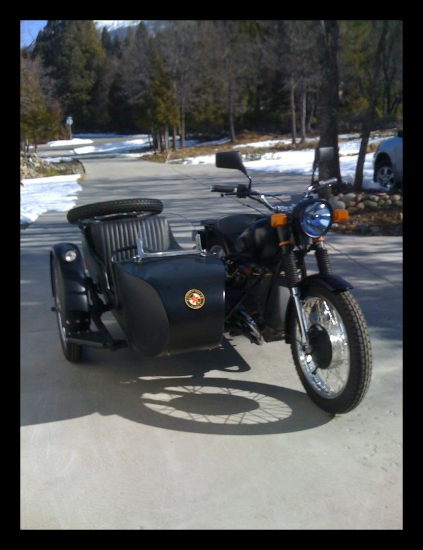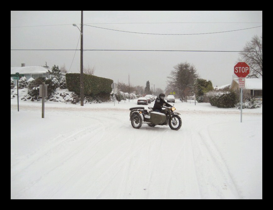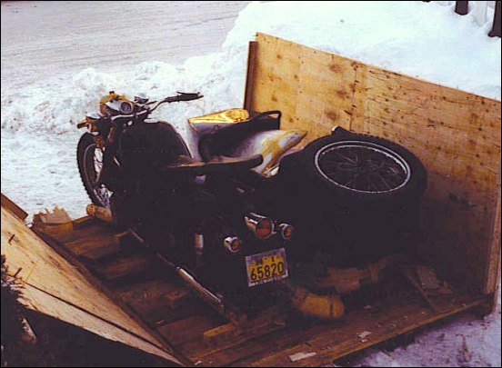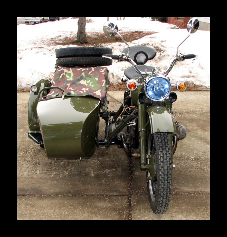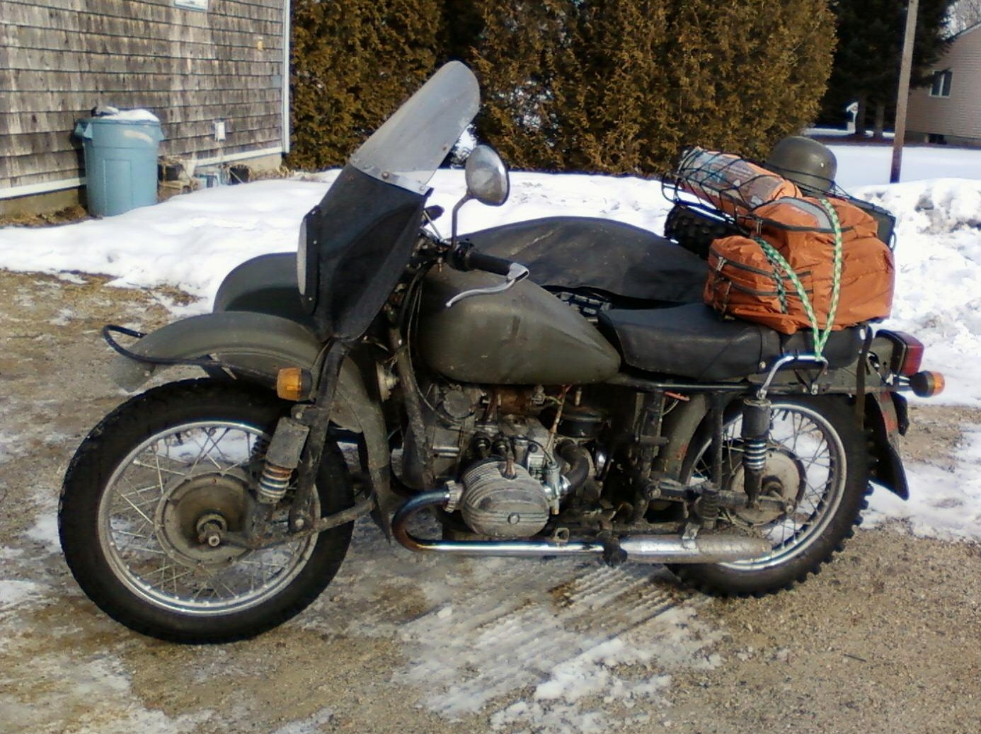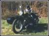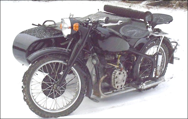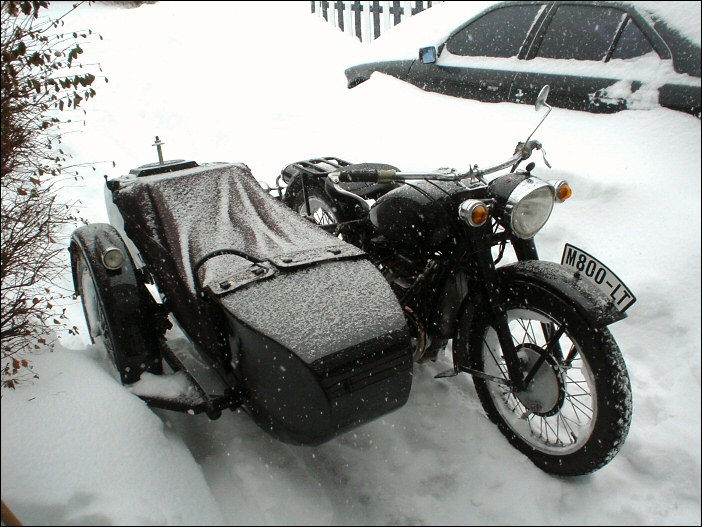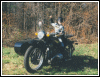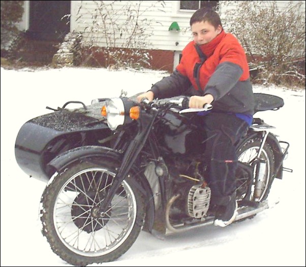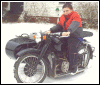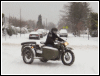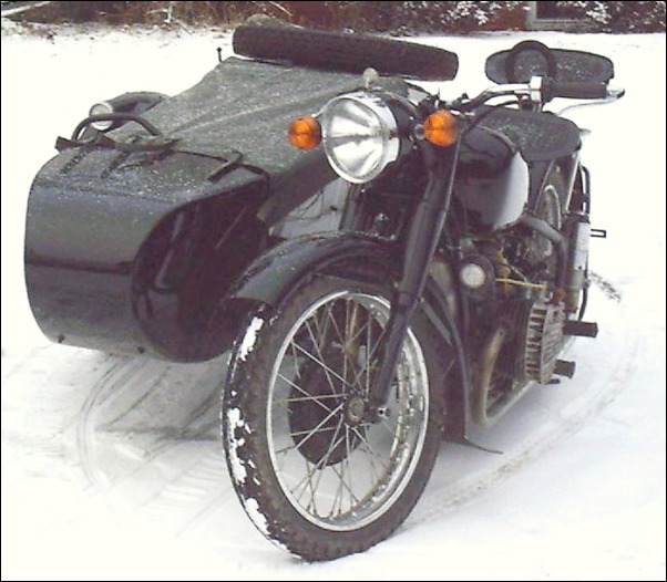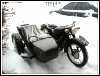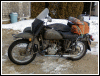 From Chris Jordan in Maine: "Here's a photo of my Chang powered Ural loaded up for a winter camping trip. As you can see it has an M1S engine, Chang gas tank and handle bars. It is a 2WD and I had no problem on the snow covered trails. The back tires are Russian made knobby tires that have studs screwed into them." | ||||