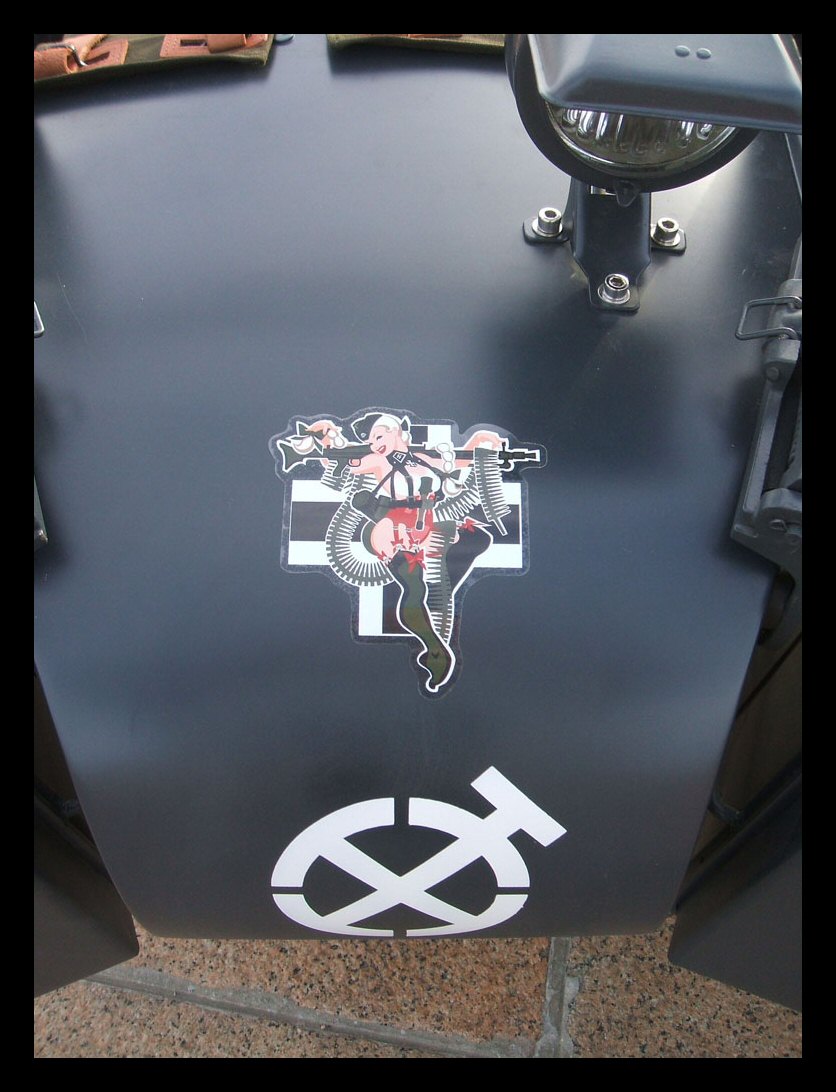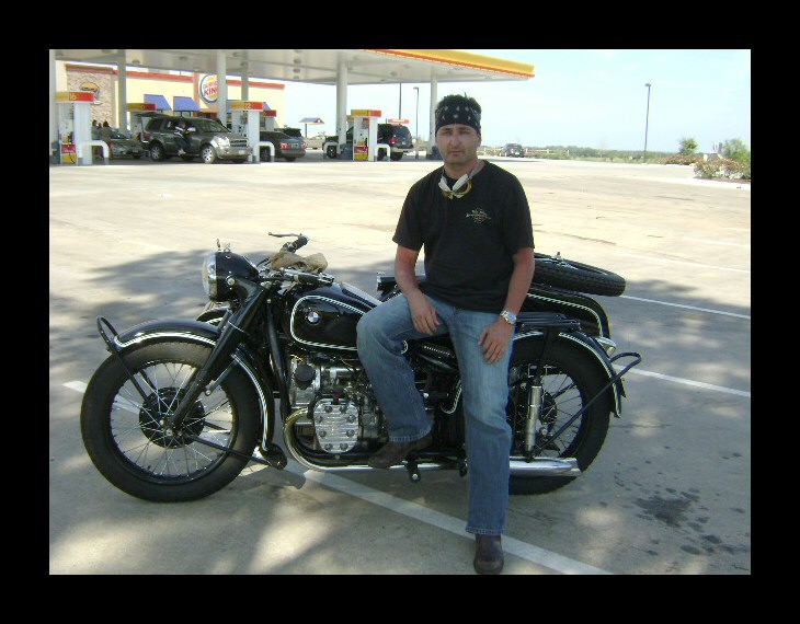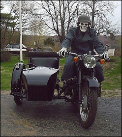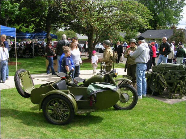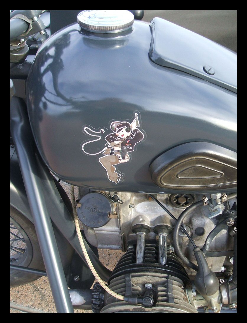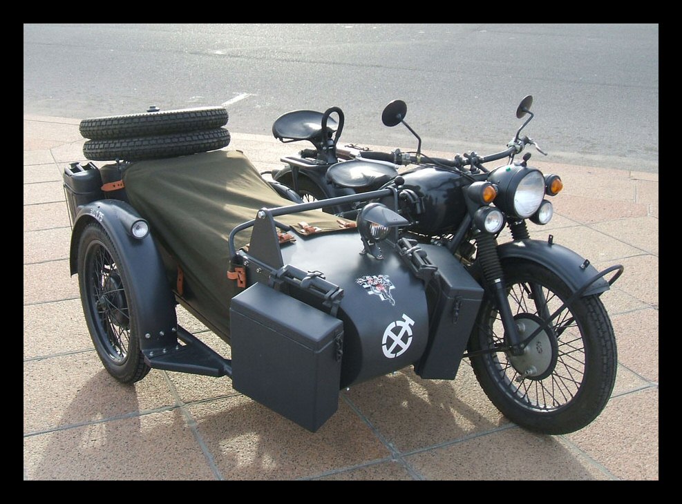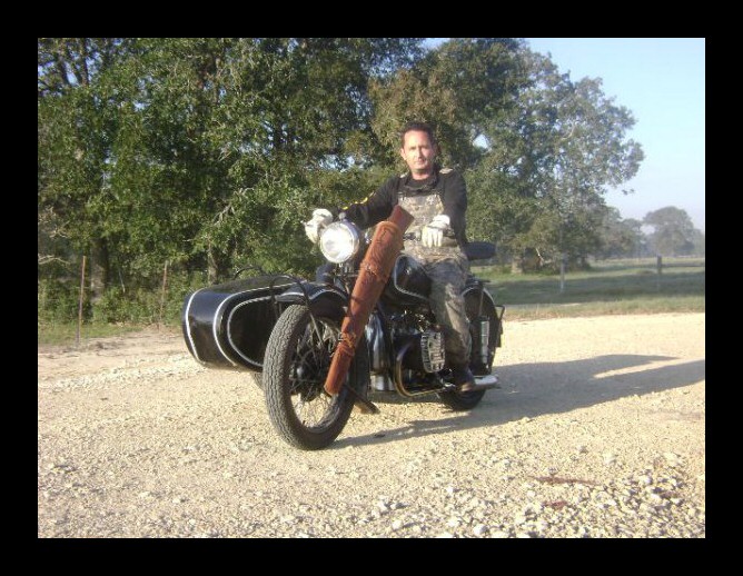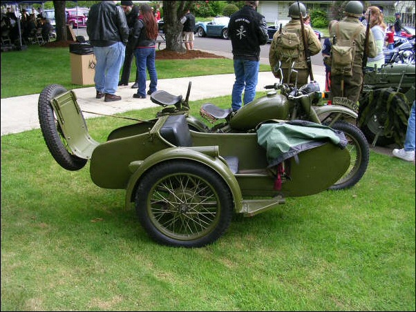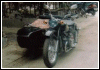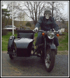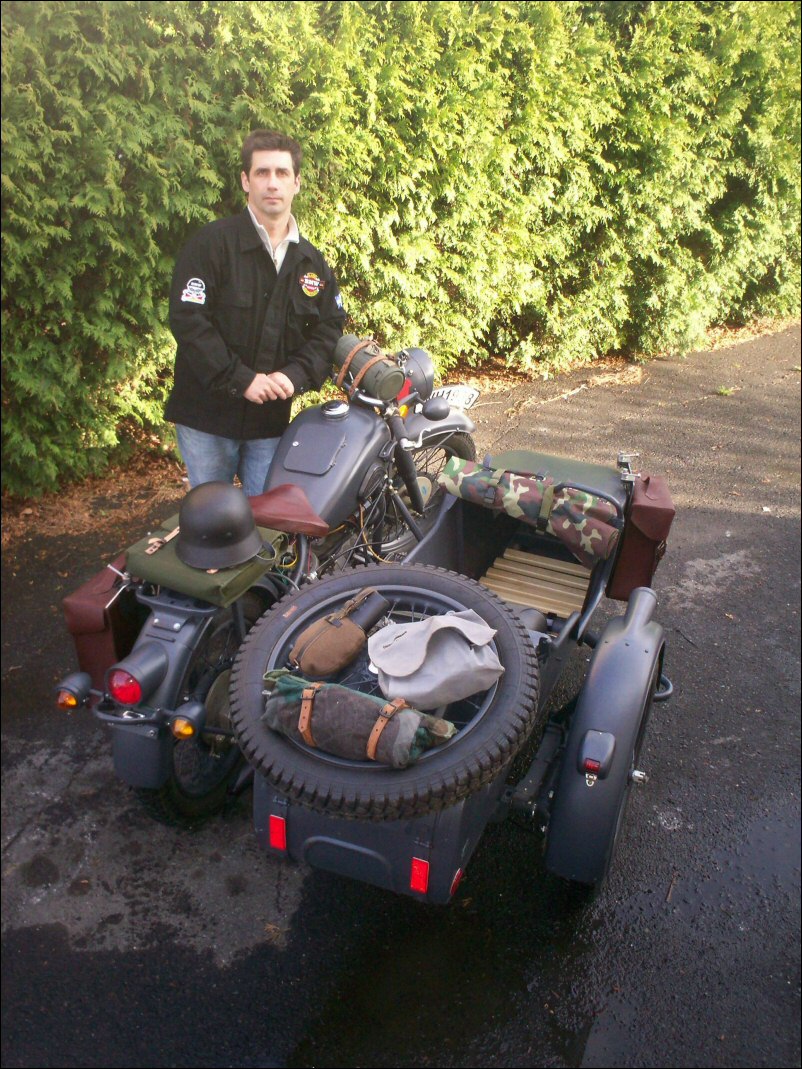 Gaeton Demers lives in Québec. He bought this WWII replica last year. Notice the tank shifter and the bullet holes in the front of the sidecar bucket! | ||||