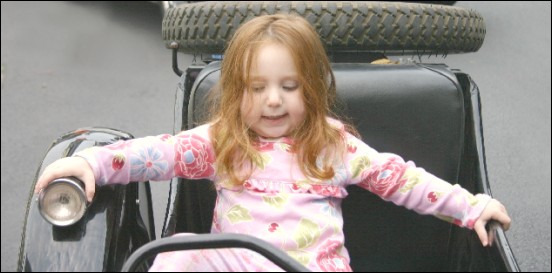 As I've said before, sidecars and children were just made for each other. Introducing future CJ enthusiast Chloe, age 2½. Andy says all they need is a seatbelt to hold her in her car seat! Look out, world. | ||||