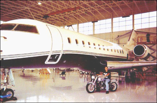 Here's Pat with his Harley. In the enlarged image you can see one the planes they build for Bombardier. Unfortunately this bike was stolen while Patrick was on a test flight! | ||||