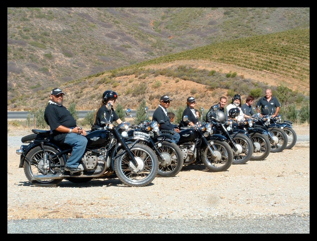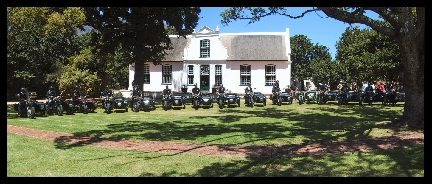 From Tim Clarke: "Here's a part of our fleet of 25 sidecars during February at the Boschendal Wine Estate in Stellenbosch, about a 90 minute drive from Cape Town. The day featured a pickup of 30 French tourists at Cape Town International Airport and a tour of the winelands tasting cheese and wine, and getting a taste of Africa!" | ||||