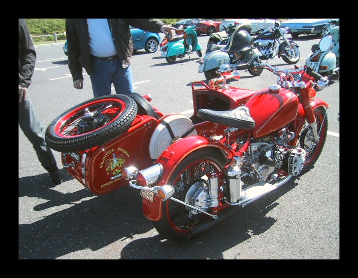 From Tim Clarke: "A chap bought a standard CJ750 from me and spent a few months converting it into a stunning fire engine. It carries genuine hoses, water bowser, siren, bells, the absolute worksvery effective with small fires... all he needs is a dalmation as his lookout." | ||