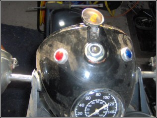 leave the bulb that lit the speedometer in place. I obtained two "large warning lights" from Vehicle Wiring Products. One red and one blue. I needed to knock out the old glass in the headlamps and widen the holes slightly to the 17mm hole required. |