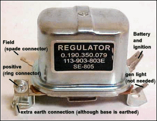 okay. The regulator unit is a Bosch 113-903-803E mechanical unit as fitted to VW Beetles and vans from about 1967 to 1975. An electronic version is also available, 211-903-803E, which retains the empty case and just mounts the electronic gizmo inside. You can get one of these new from places like Volkspares for about £21. It will almost mount straight on, but alas, the mounting holes are a handful of cm too narrow, but an extra piece of metal with a couple of holes bolted across sorts that in moments. |