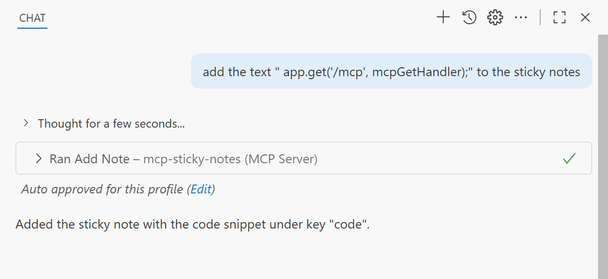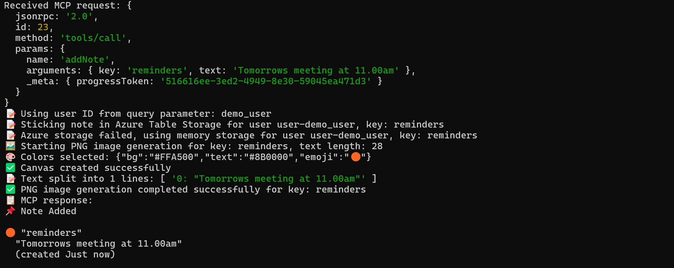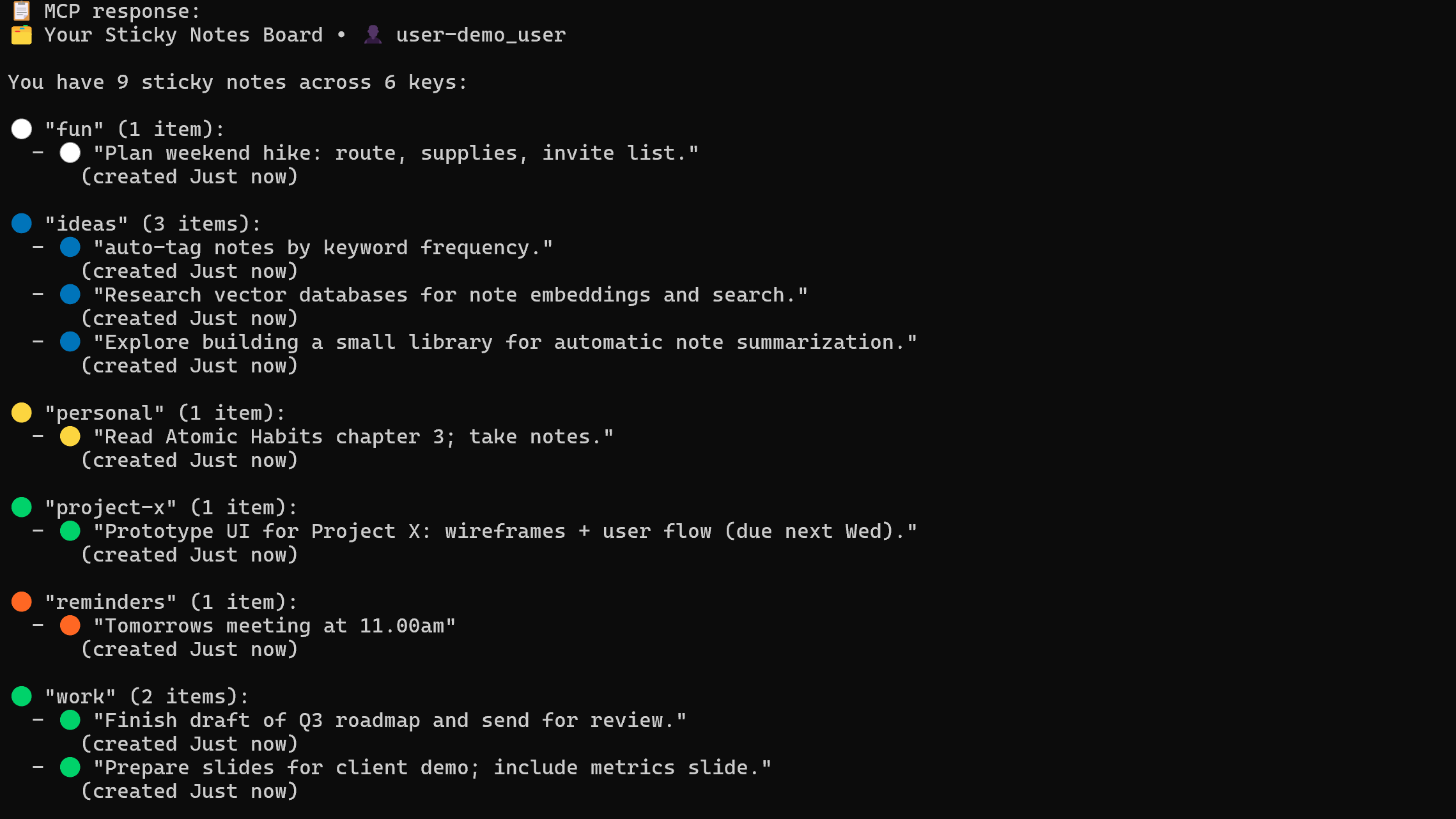 ##### 💻 Run Locally ```npx ts-node server.ts``` Server responds on ```http://localhost:3000``` Update your mcp.json: ``` { "servers": { "mcp-sticky-notes": { "url": "http://localhost:3000/mcp?userId=demo_user" } } } ```