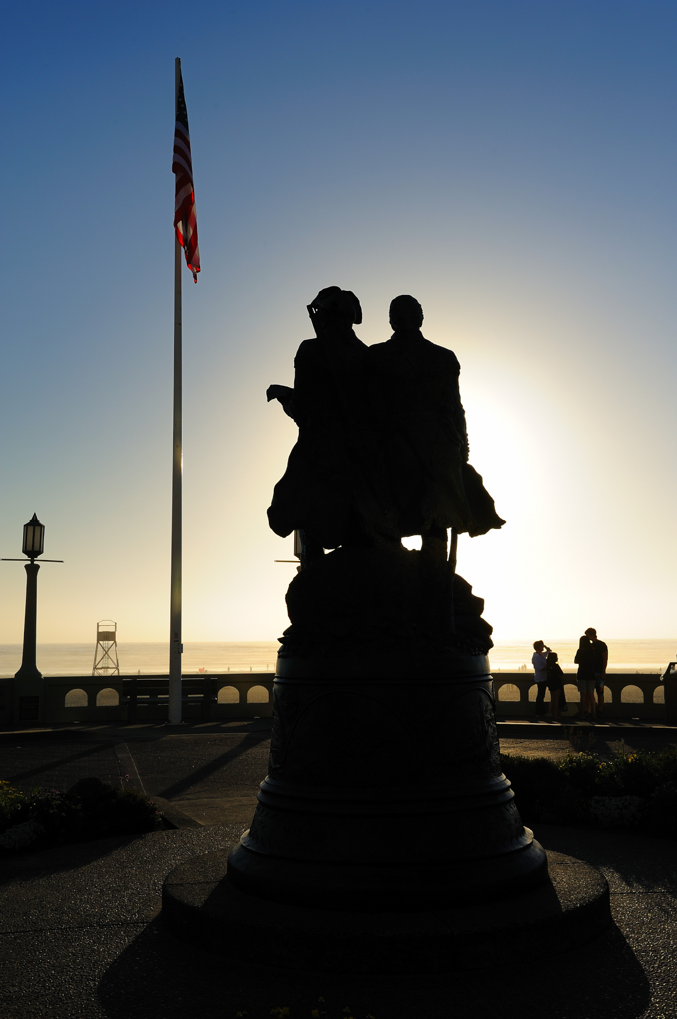 Later, I returned with a tripod, only to find the statue’s base in deep shade. On my next attempt, the heads of Lewis and Clark were perfectly aligned with the flag’s shadow. A third try? The flagpole’s shadow already stretched from top to bottom of the statue. By then, the sun was low, casting long shadows across everything. In the end, the very first handheld version had the best lighting of the day.