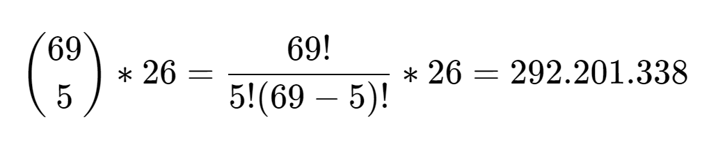 $$ \displaystyle {69\choose 5}*26=\frac{69!}{5!(69-5)!}*26=292.201.338 $$