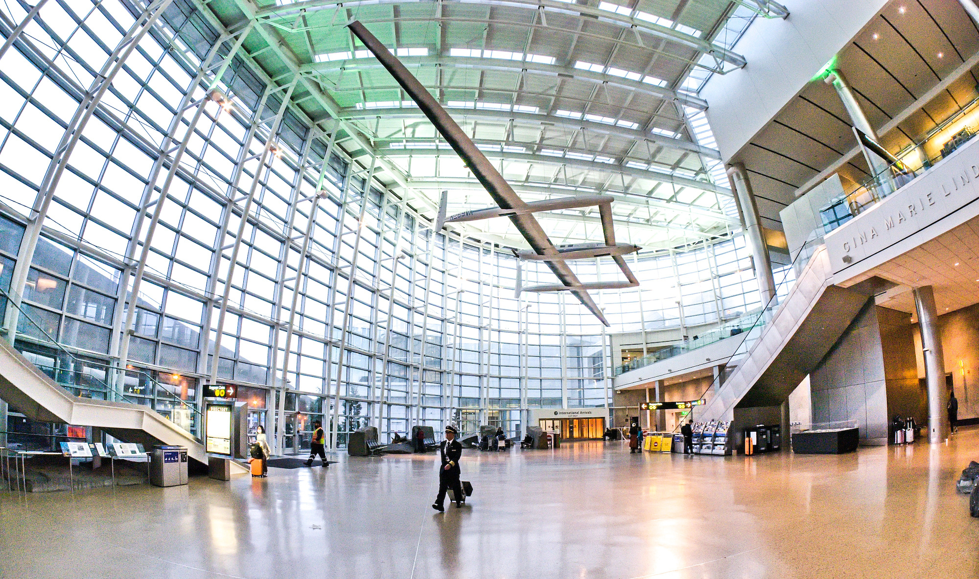 The Arrival Hall has the tallest ceiling in the Seattle Airport with a copy of Burt Ratan's Voyager endurance plane.