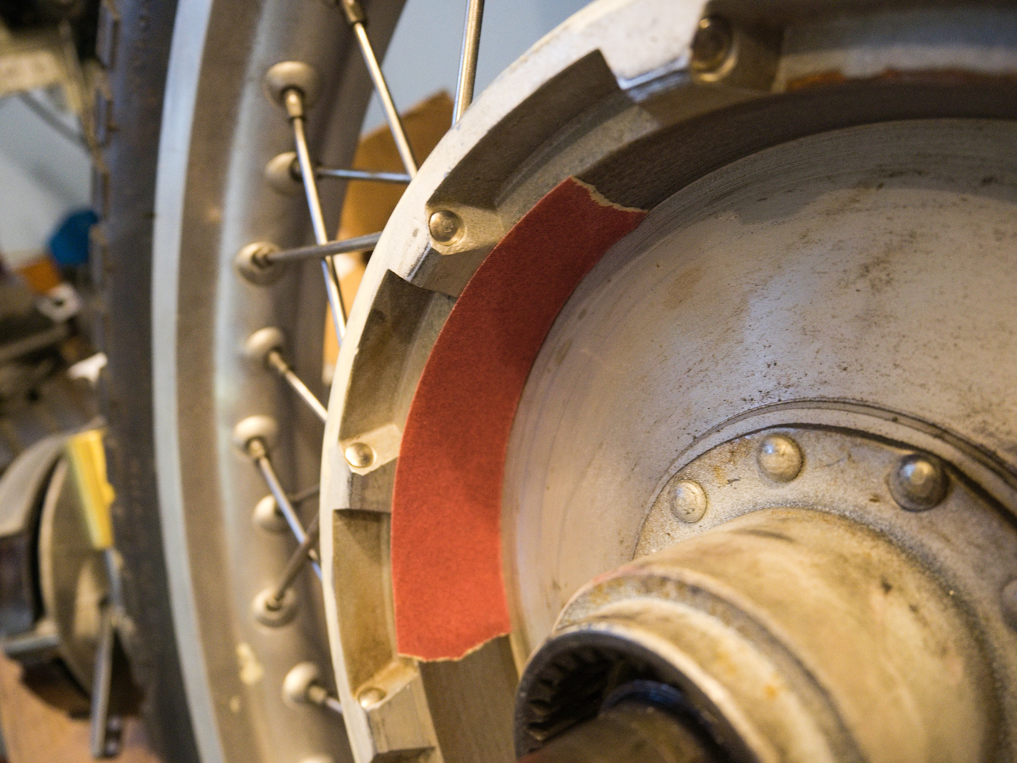 The final drive is inserted and rotated a few times. This aligns both brake pads with the self-adhesive sandpaper to maximize braking power. The sandpaper is then removed and the inside is cleaned with brake cleaner.
