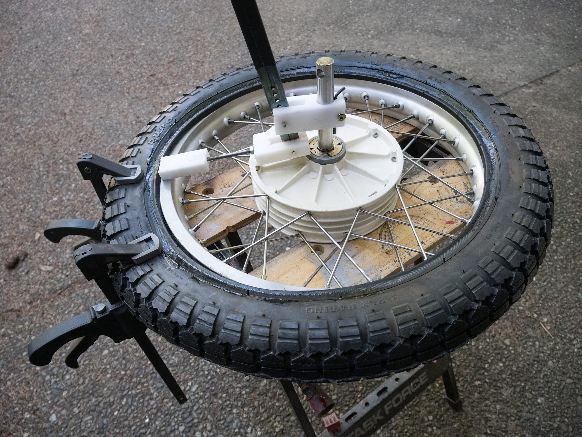 The trick is to squeeze the tire on one side with clamps to have more room on the other side. This is for removing and installing.