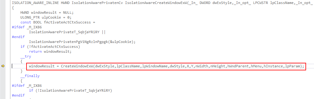 ISOLATION_AWARE_INLINE HWND IsolationAwarePrivatenCv IsolationAwareCreateWindowExW(_In_ DWORD dwExStyle,_In_opt_ LPCWSTR lpClassName,_In_opt_ LPCWSTR lpWindowName,_In_ DWORD dwStyle,_In_ int X,_In_ int Y,_In_ int nWidth,_In_ int nHeight,_In_opt_ HWND hWndParent,_In_opt_ HMENU hMenu,_In_opt_ HINSTANCE hInstance,_In_opt_ LPVOID lpParam)