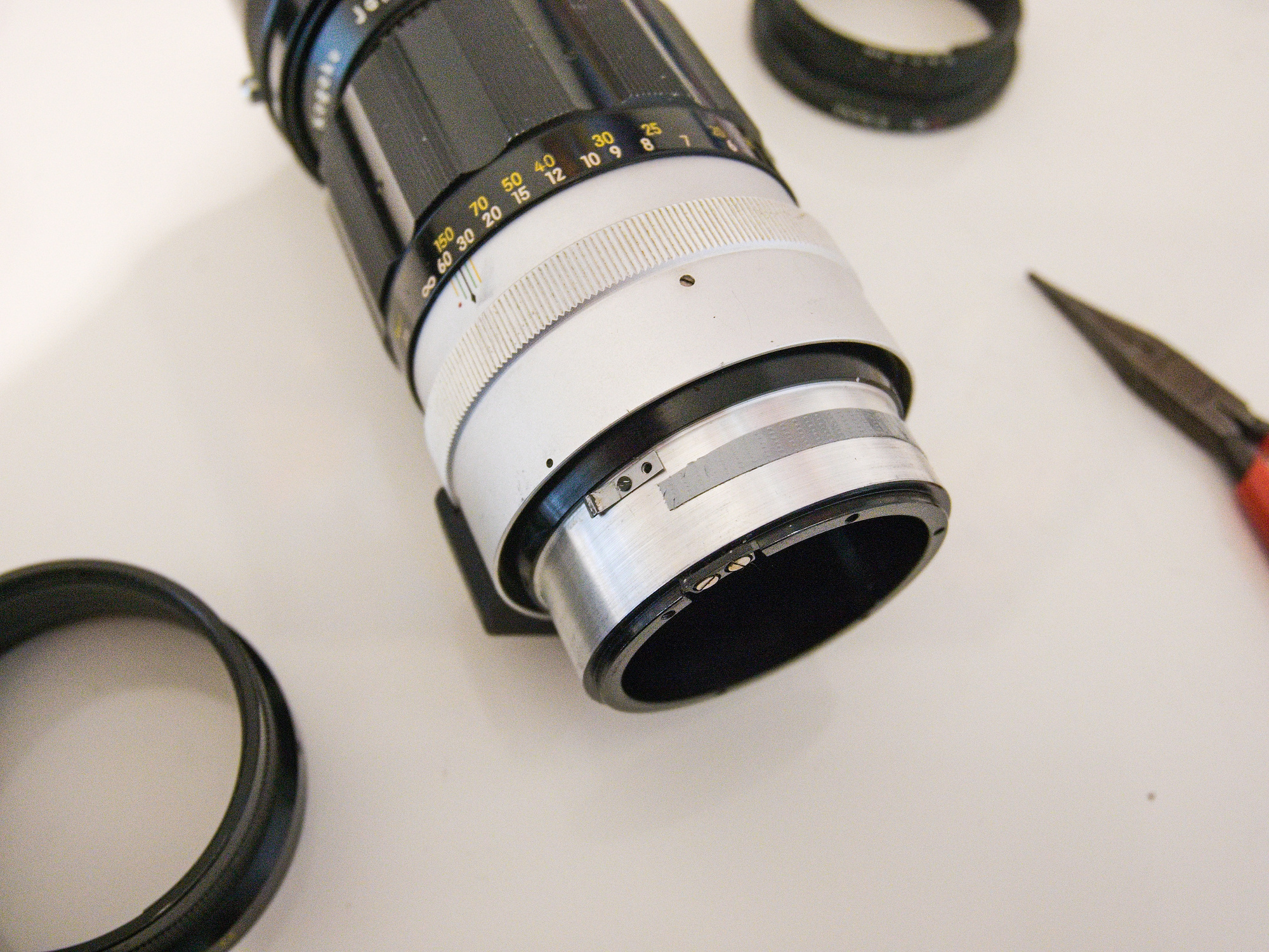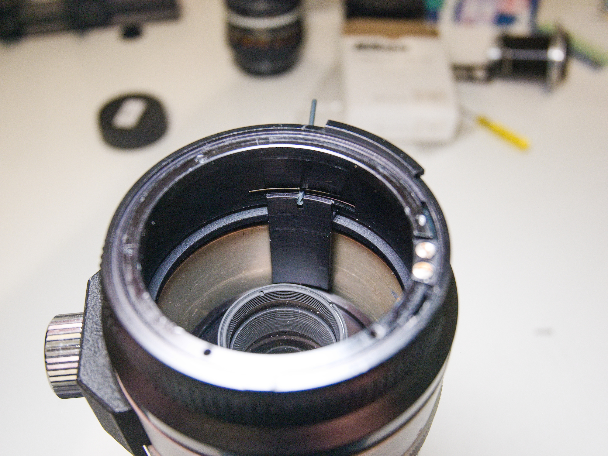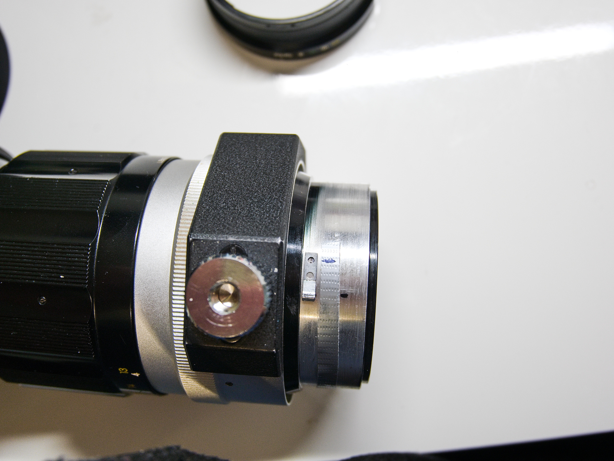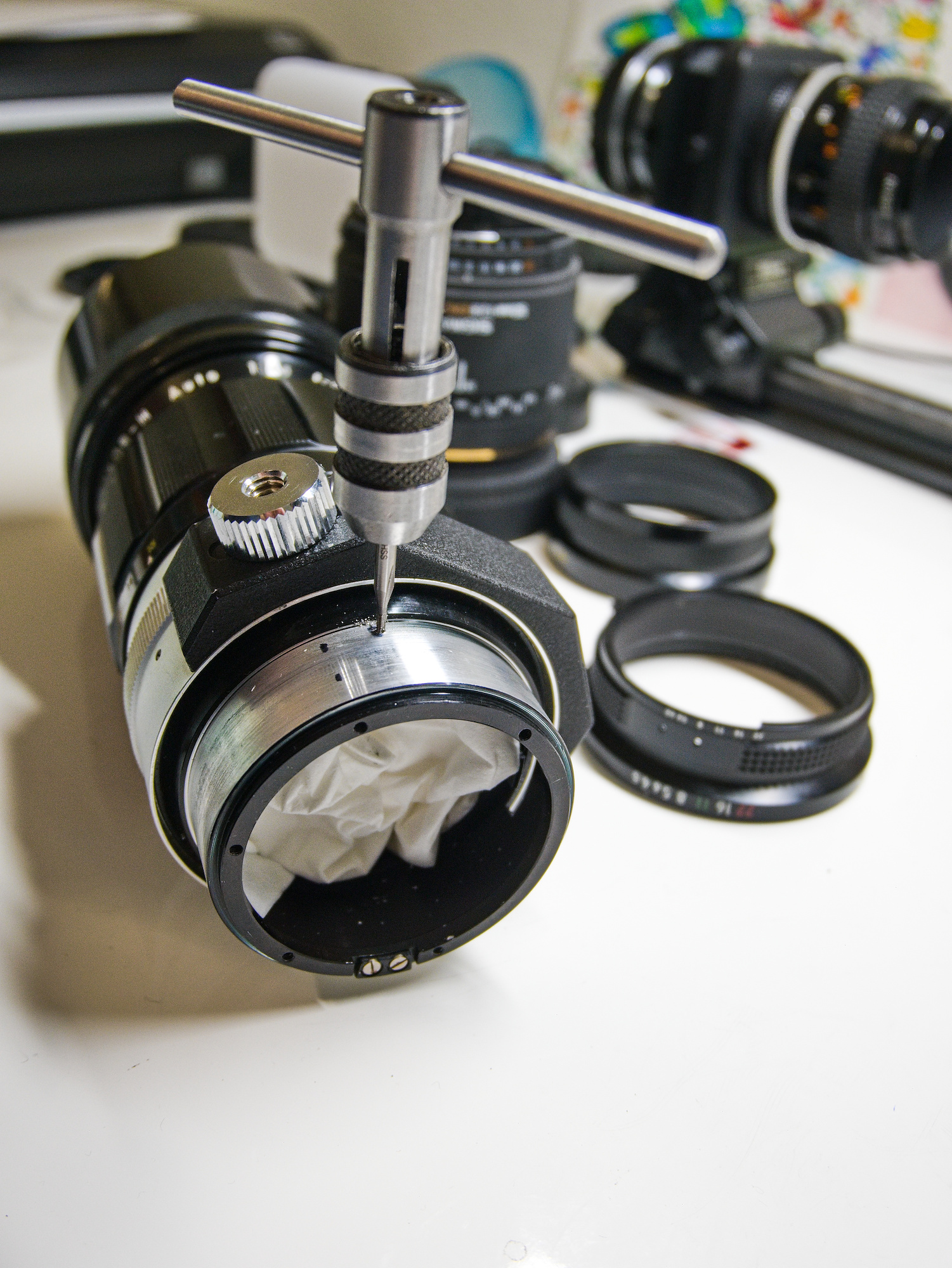 The kit #52 differs from #53 that the screw to connect to the aperture lever is not used anymore and replaced by a notch in the aperture ring at the same position. To make #52 work with this lens, a small hole is drilled and tapped to use the original screw: