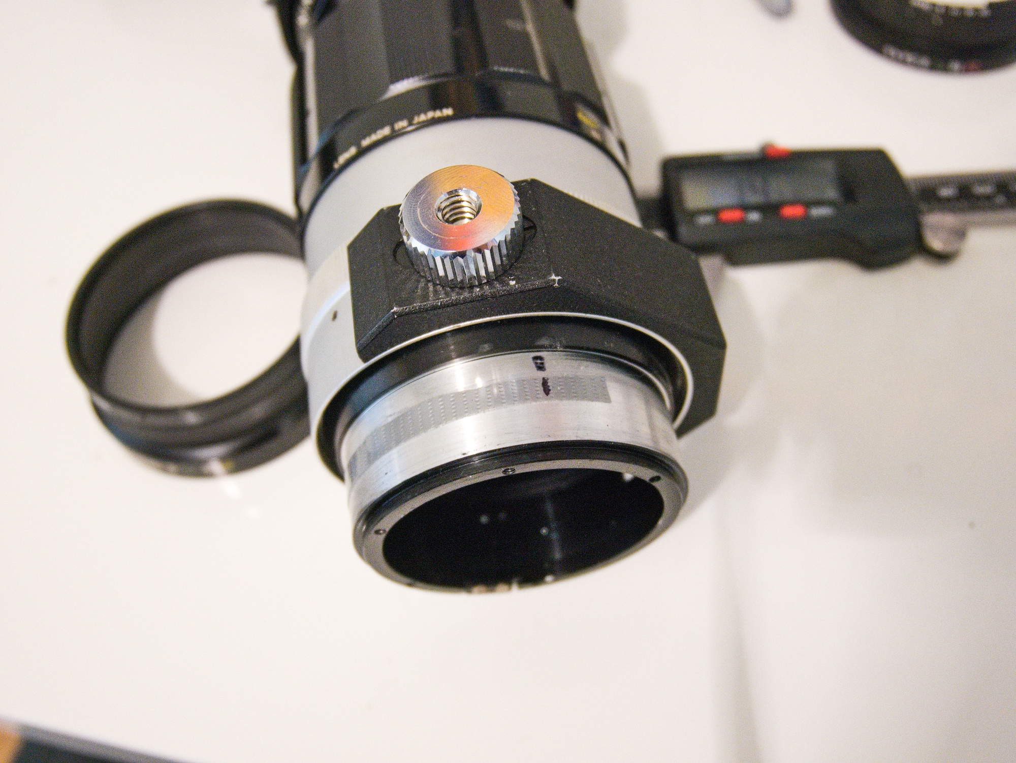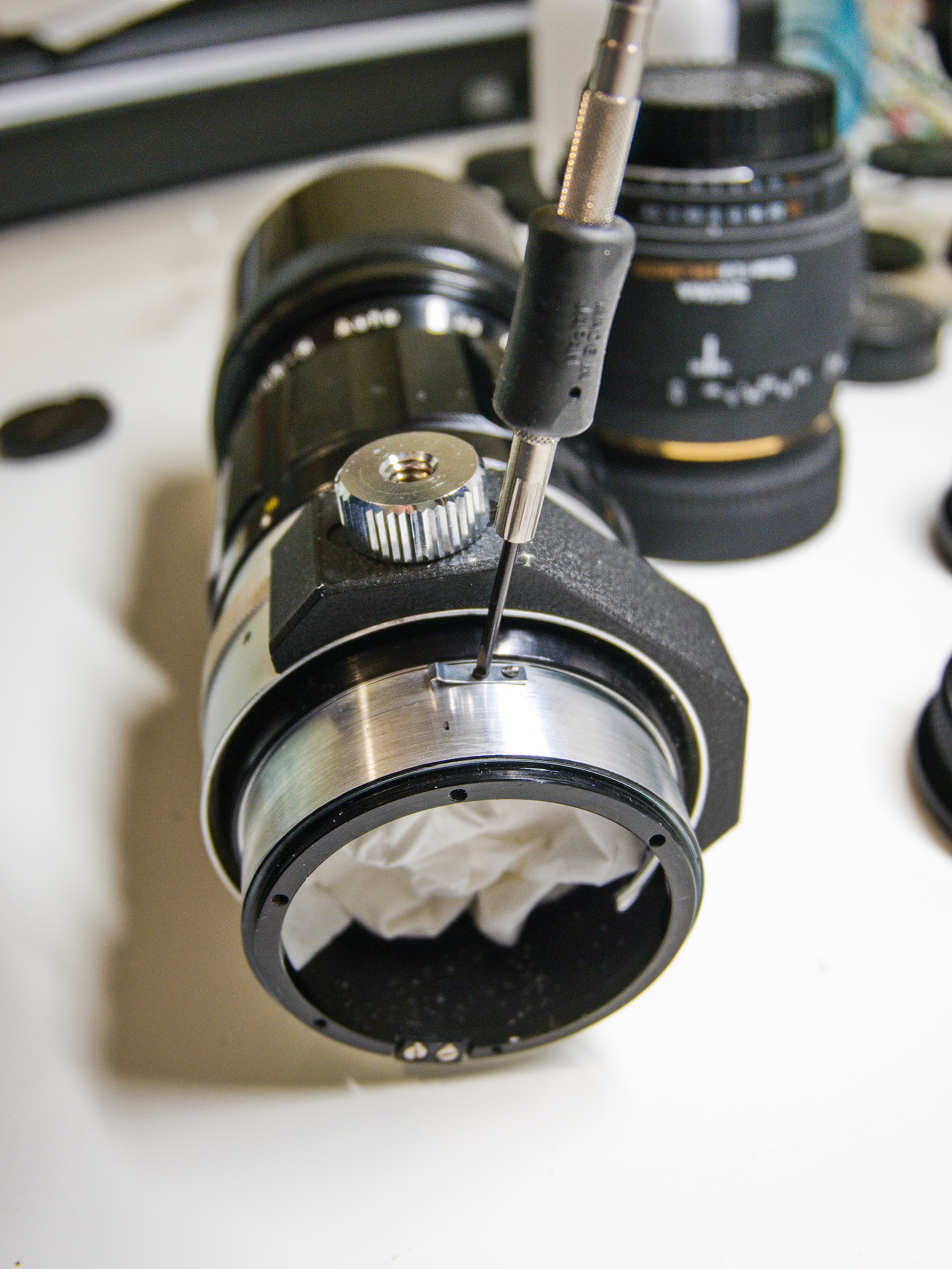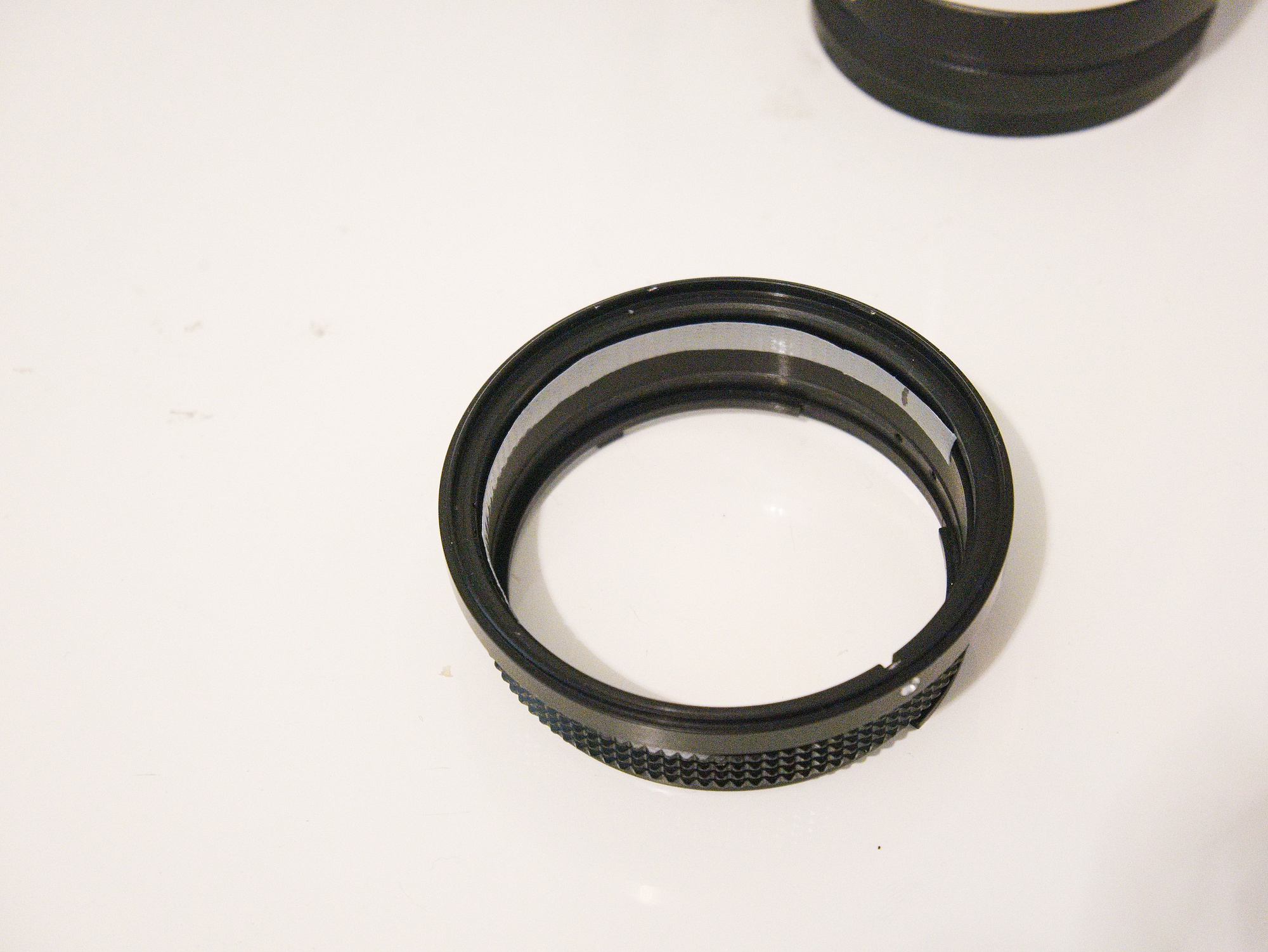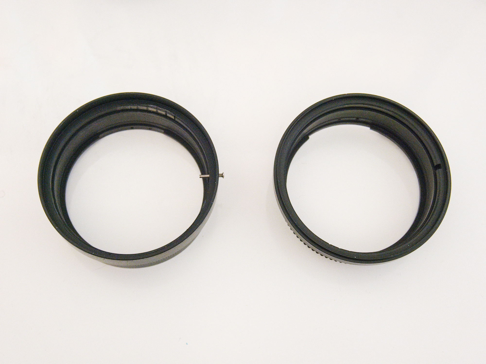 The kit #52 differs from #53 that the screw to connect to the aperture lever is not used anymore and replaced by a notch in the aperture ring at the same position. To make #52 work with this lens, a small hole is drilled and tapped to use the original screw: