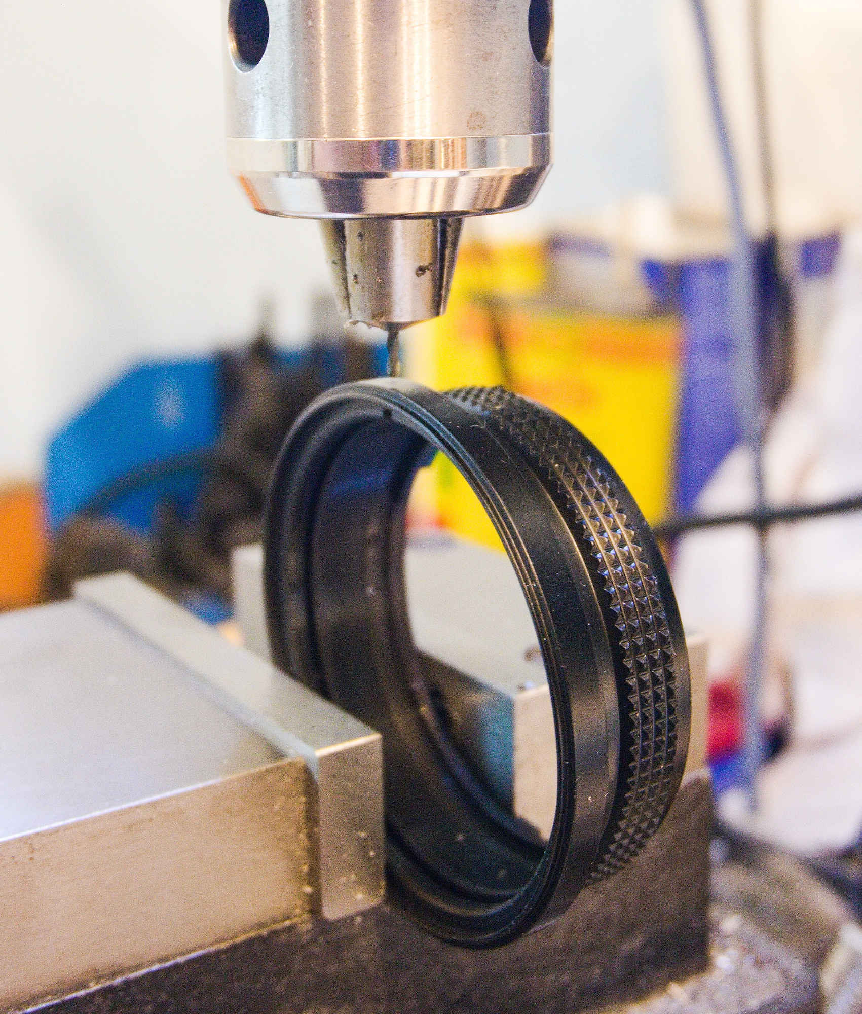 The 1.5mm hole is drilled at the notched position in the new aperture ring from conversion kit #52. Ideally the hole should be 1.35mm for a M1.7 thread but the 1.5mm drill was the closest I had and for this purpose good enough: