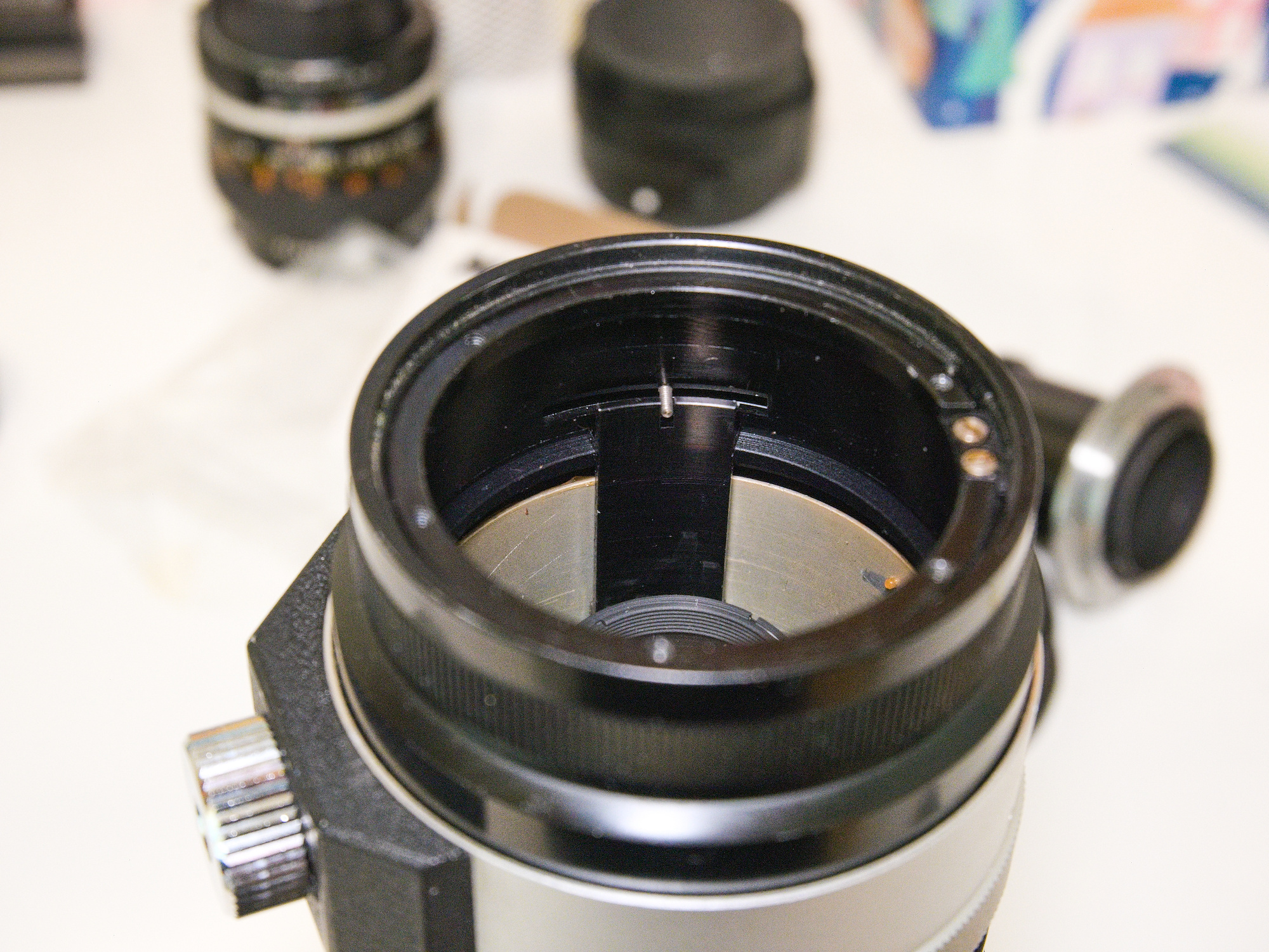 In 1977, Nikon started using the automatic indexing of the lenses. This replaces the manual indexing done before by alining the metal fork on the lens with the camera pin.