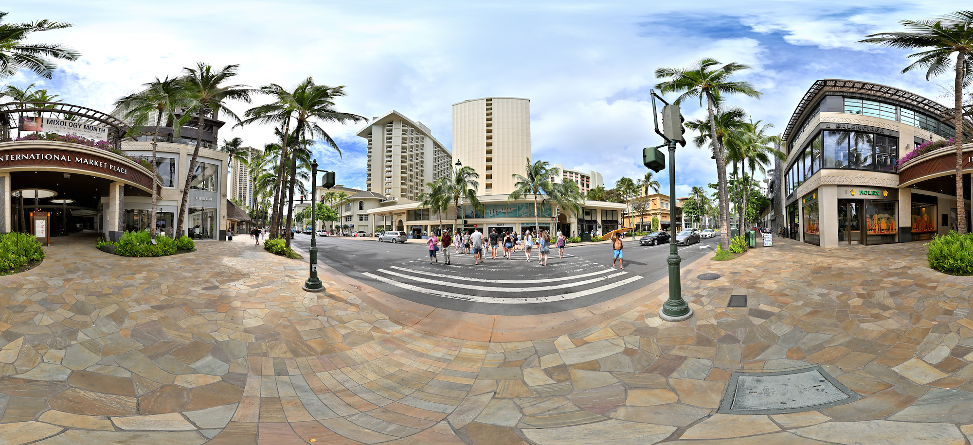 Honolulu Shopping Street, Oahu, Hawaii 📅 19. September 2023 · Panorama Busy shoppers crossing the Kalakaua Avenue in Honolulu. Interactive Panorama Honolulu Shopping Street