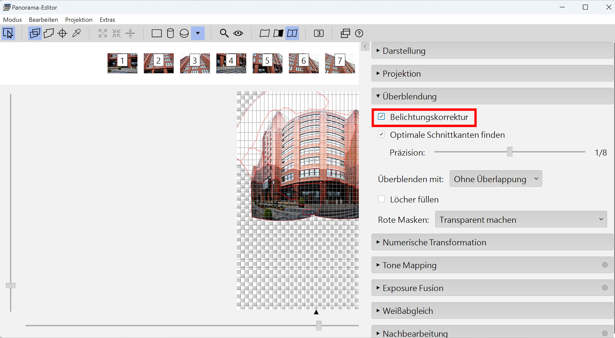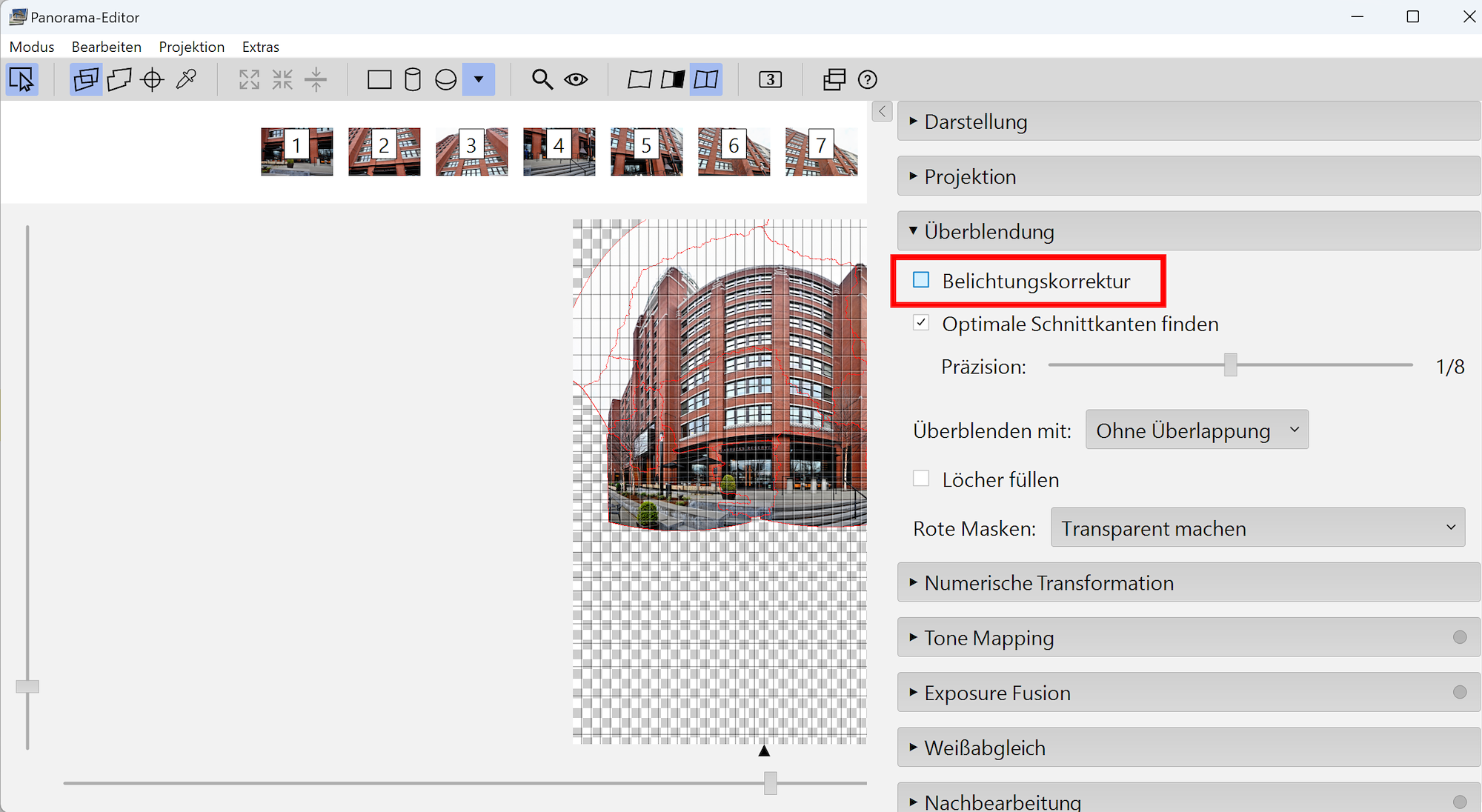 Pictures taken for panoramic images should always have the same exposure by using the manual exposure setting on the camera, but sometimes this is not always the case as in Uneven Exposures.