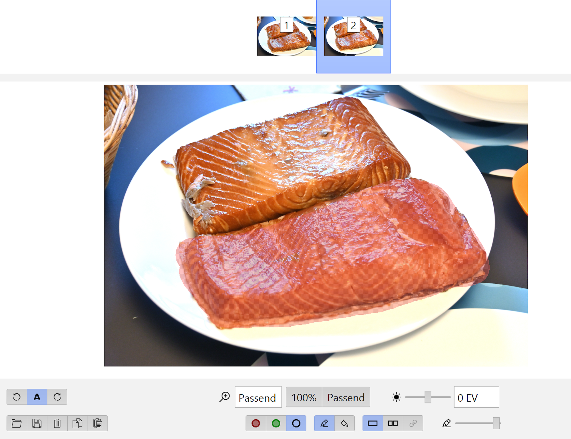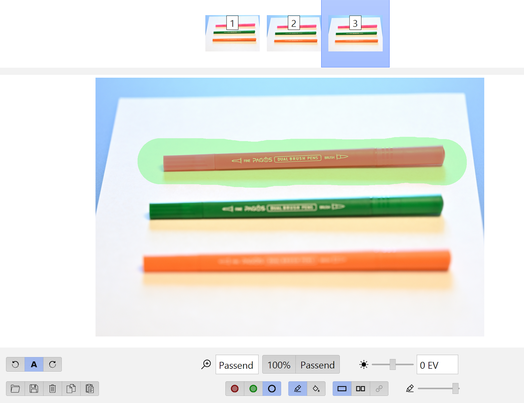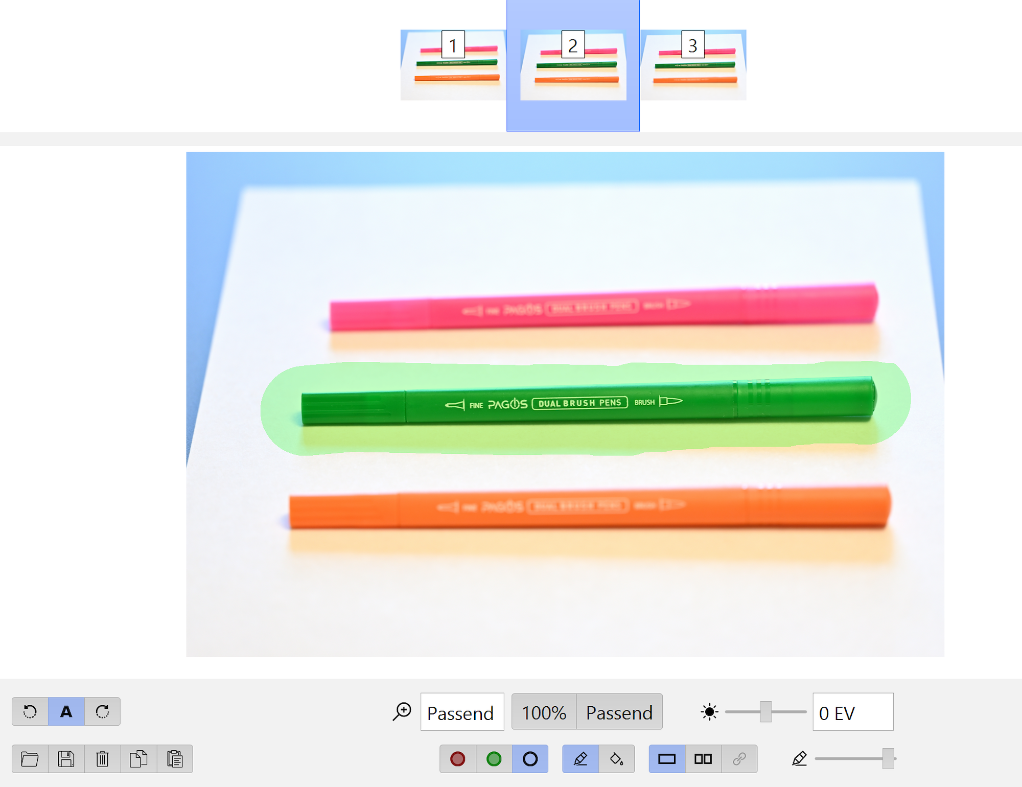 Rather than selecting the object in focus as in the previous example (using the green mask), you can deselect the object that is not in focus (using the red mask):