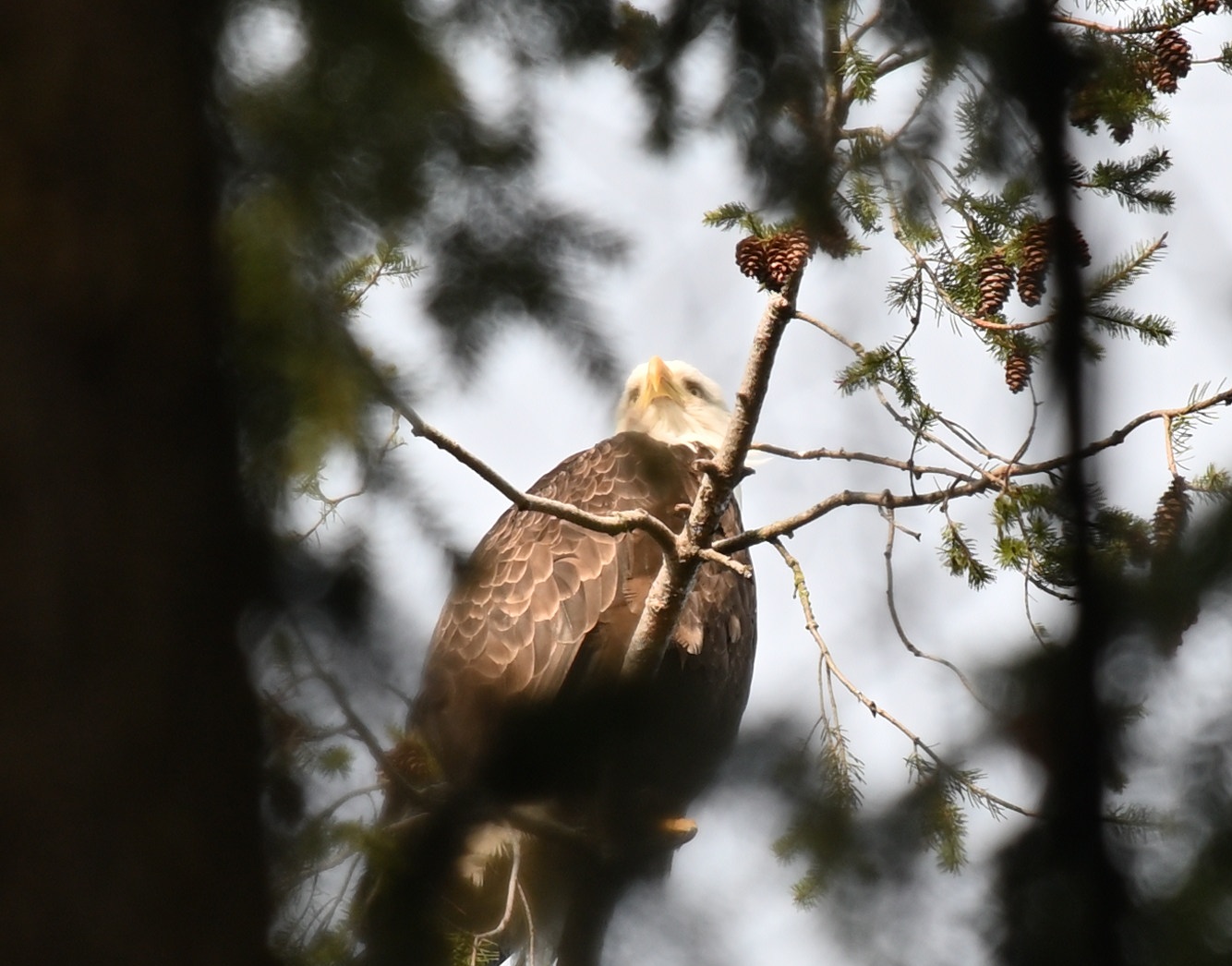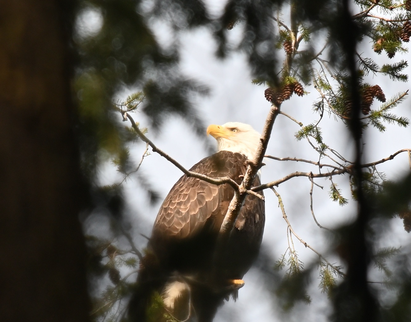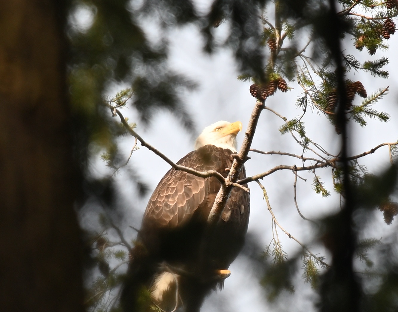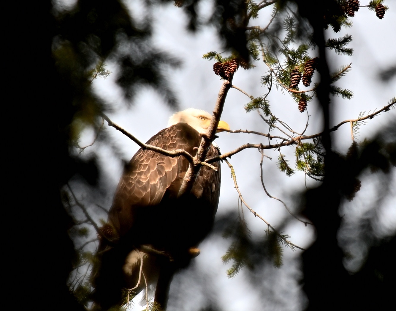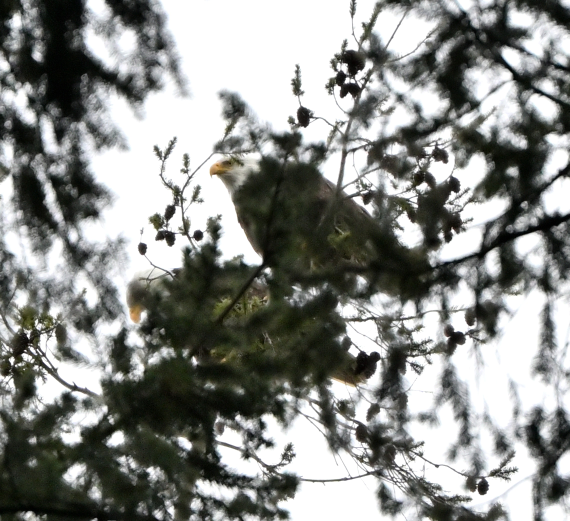 Die beiden Weißkopfseeadler wohnen seit ein paar Jahren bei uns im Garten ganz oben im Baum.