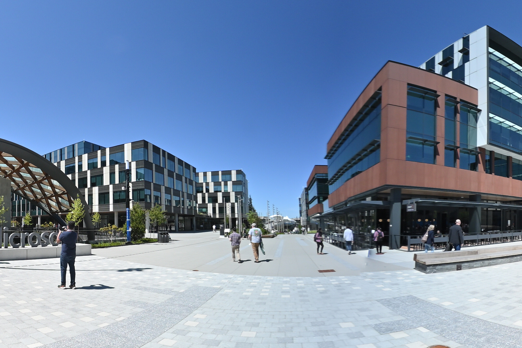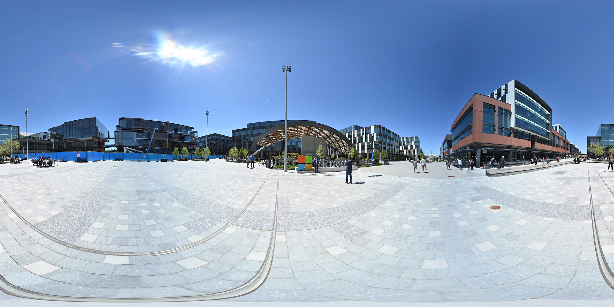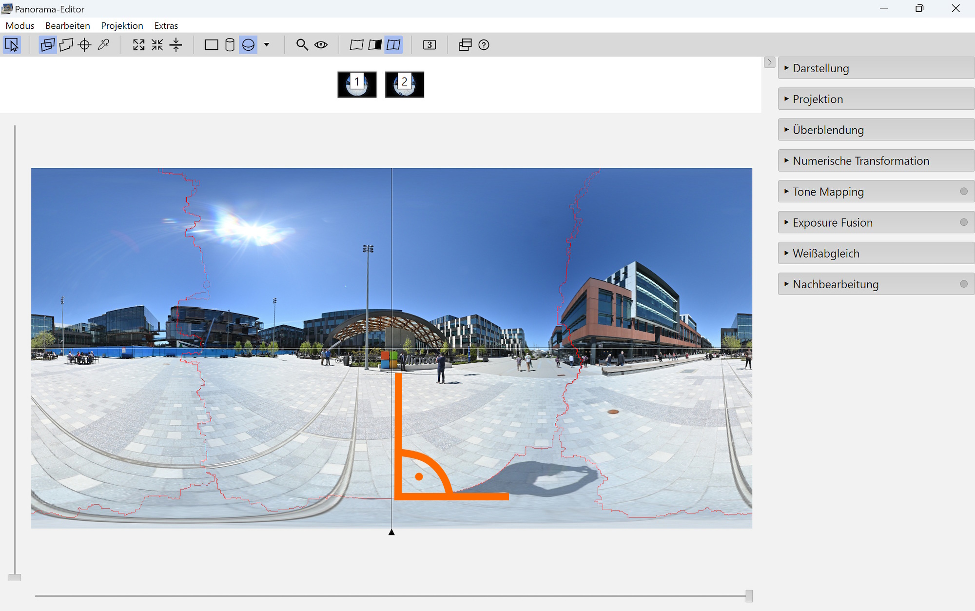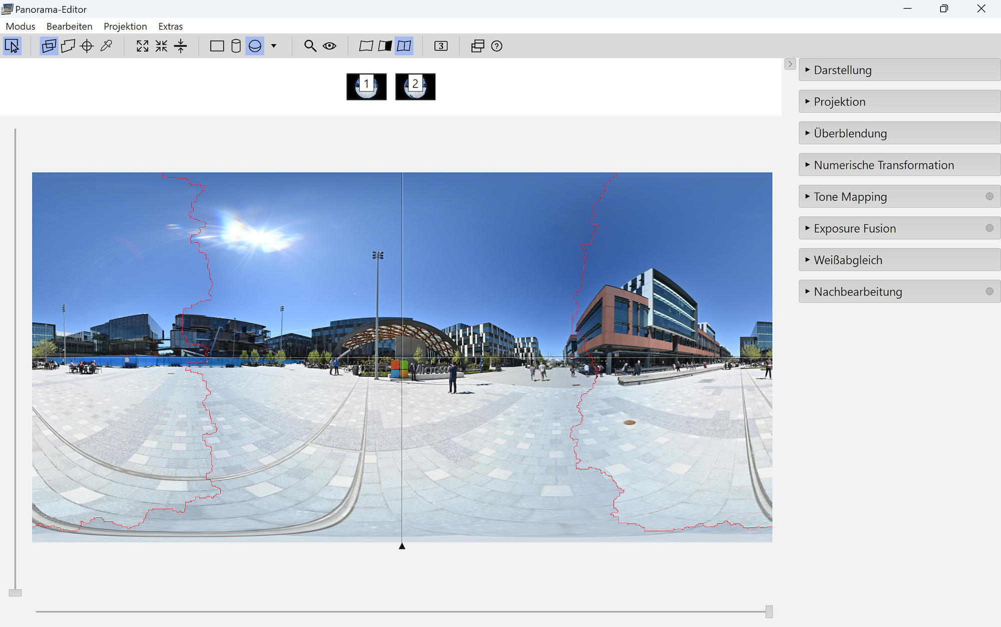 The two images were taken without a tripod, so the stitch doesn't result in everything perfectly vertical and also has some minor misalignments. And with only two images, there is not much to vary. A nodal point adapter is recommended.