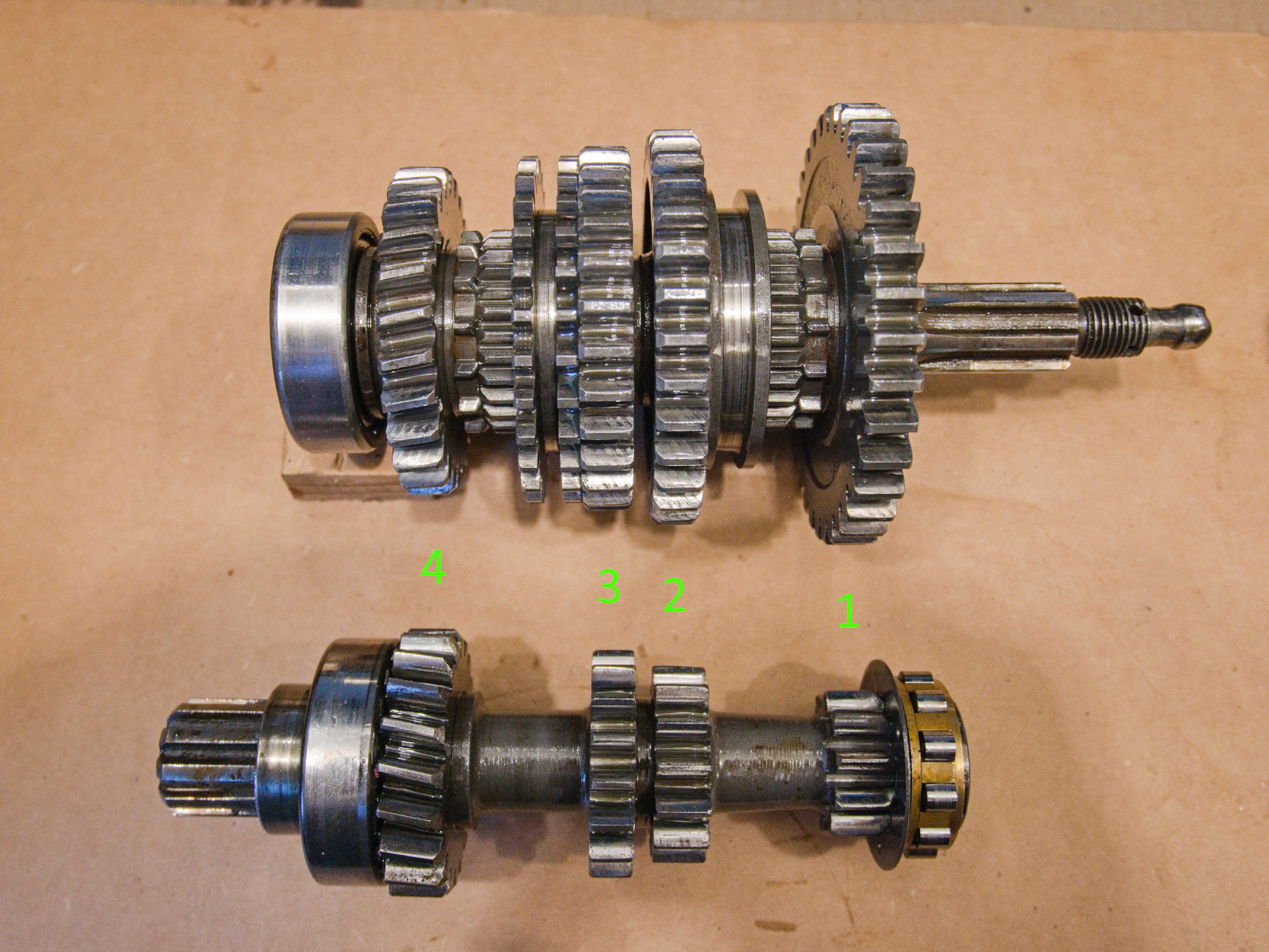 Gears on the upper output shaft are all free spinning and can be replaced easily, while the lower input shaft has only the 4th gear pressed on. The 1st, 2nd and 3rd are fixed and part of the input shaft structure.