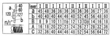 The lead screw has 12 threads per Inch. The conversion from Inch to metric is done by connecting the 'b' gear to the 120 gear instead of the 127 gear.