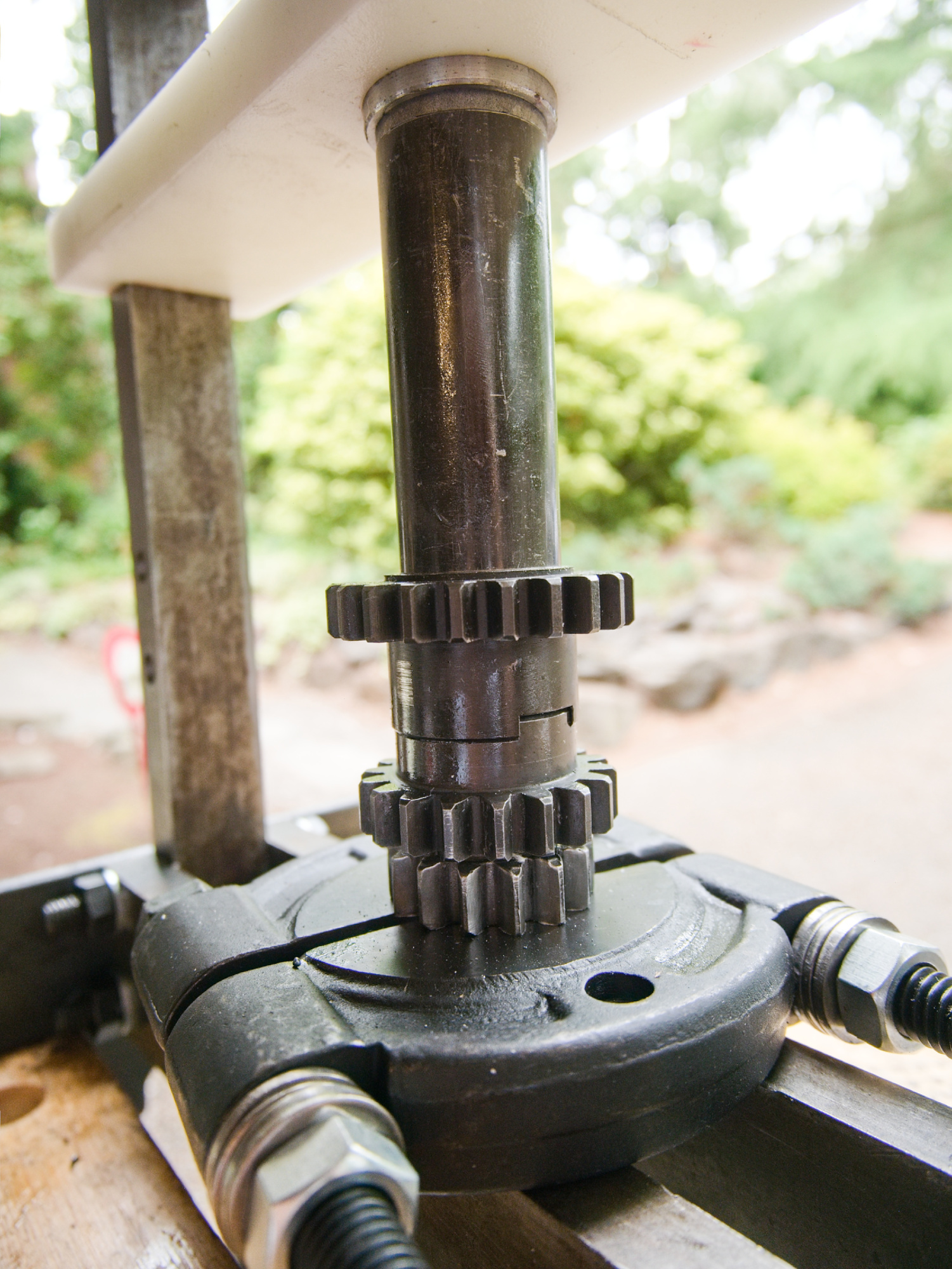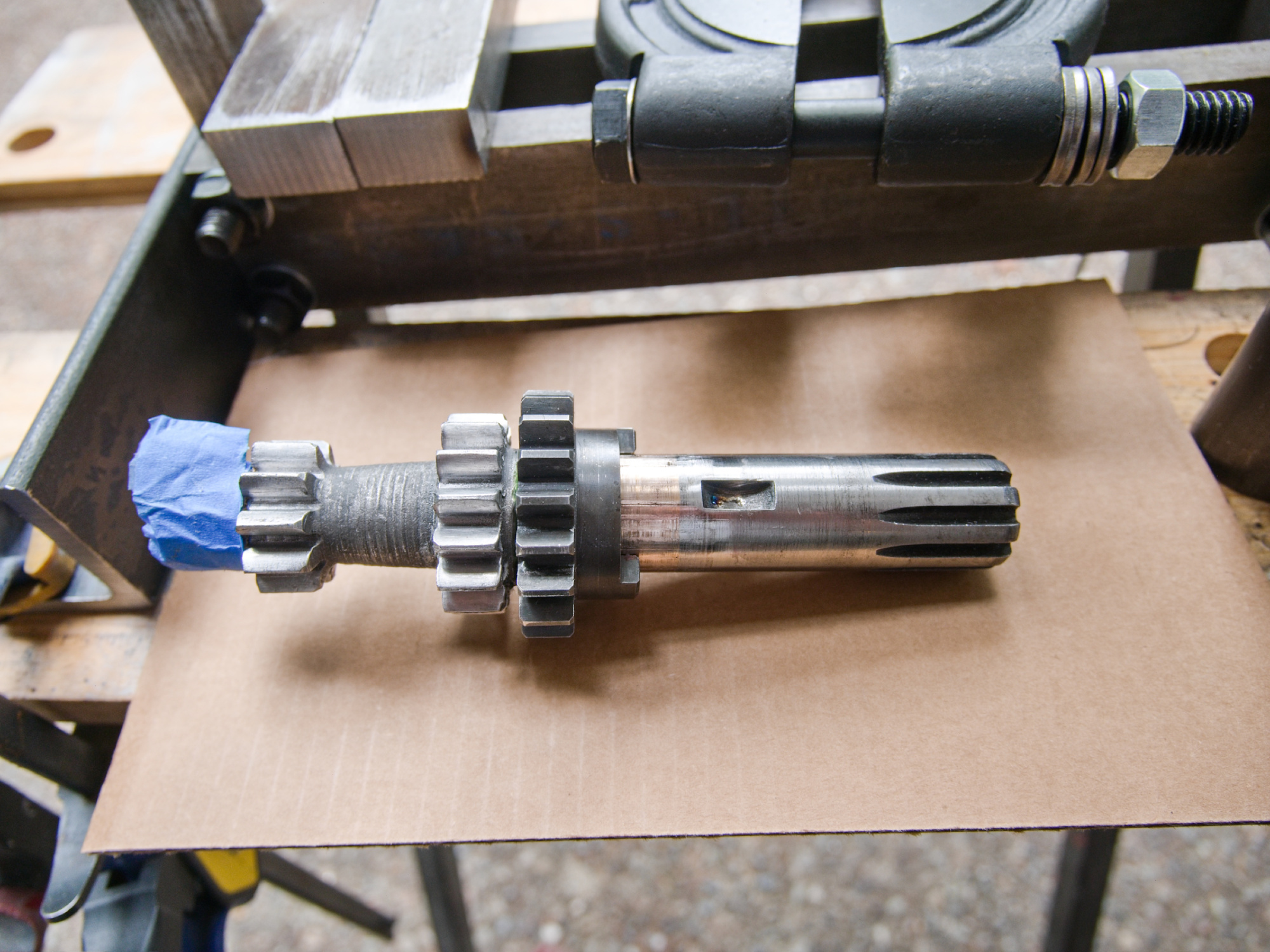 The 3rd gear gets pressed on first. Note the angular position of the gear as it locks into the later 4th gear.
