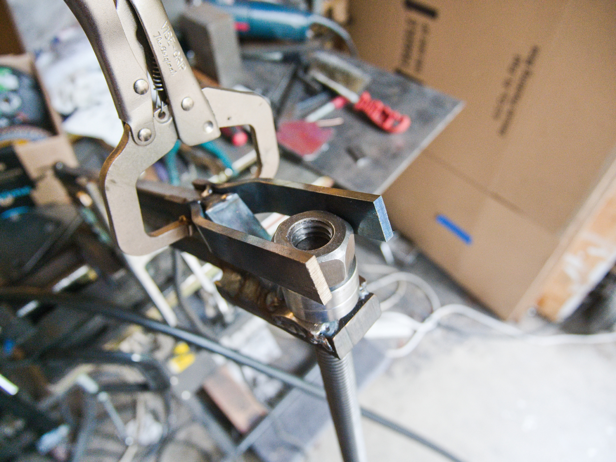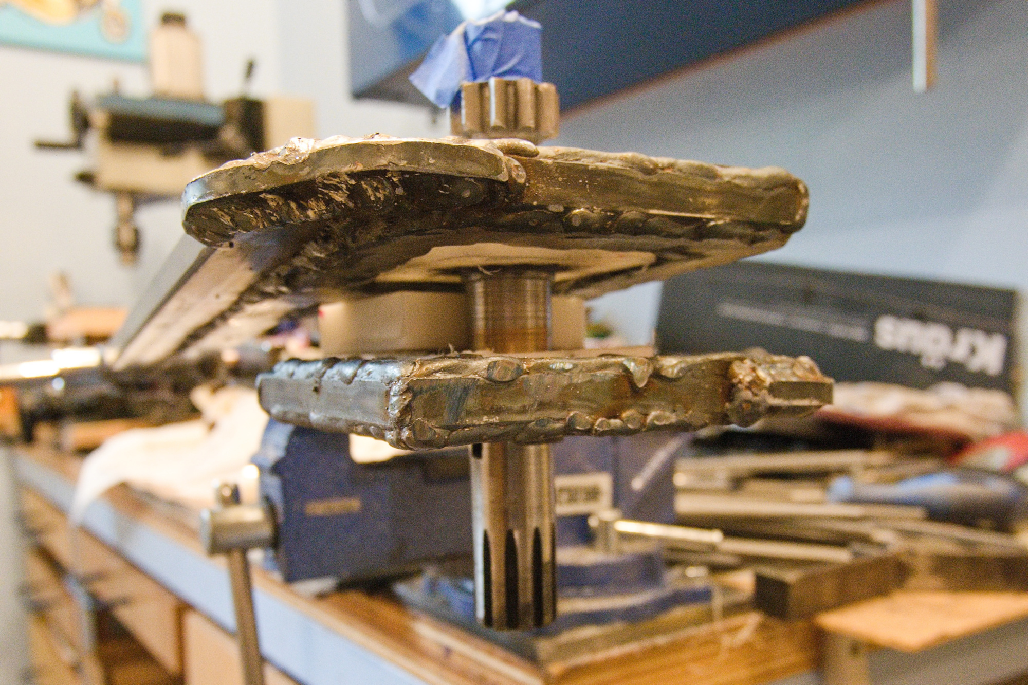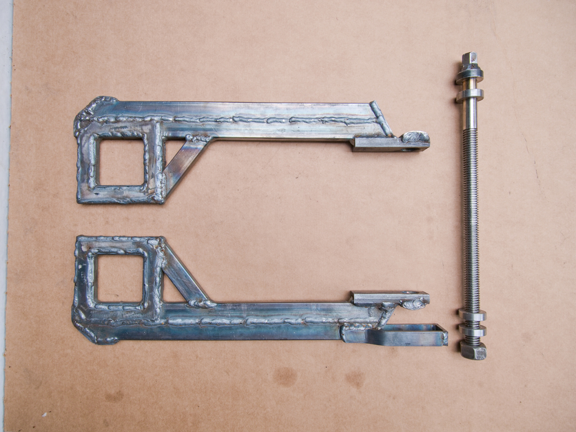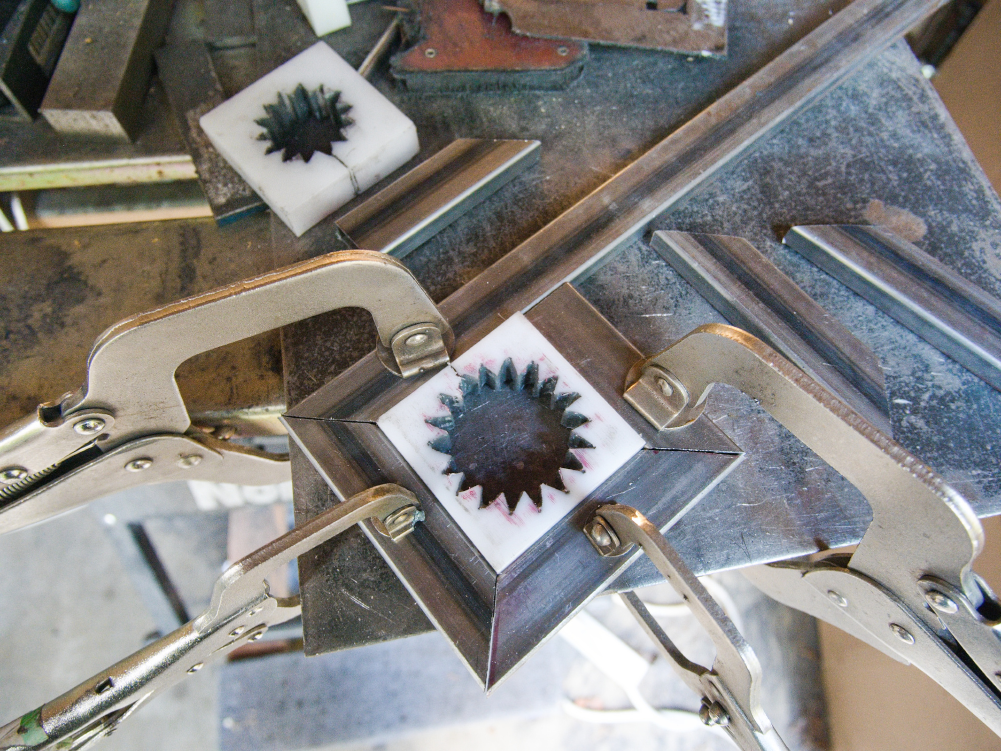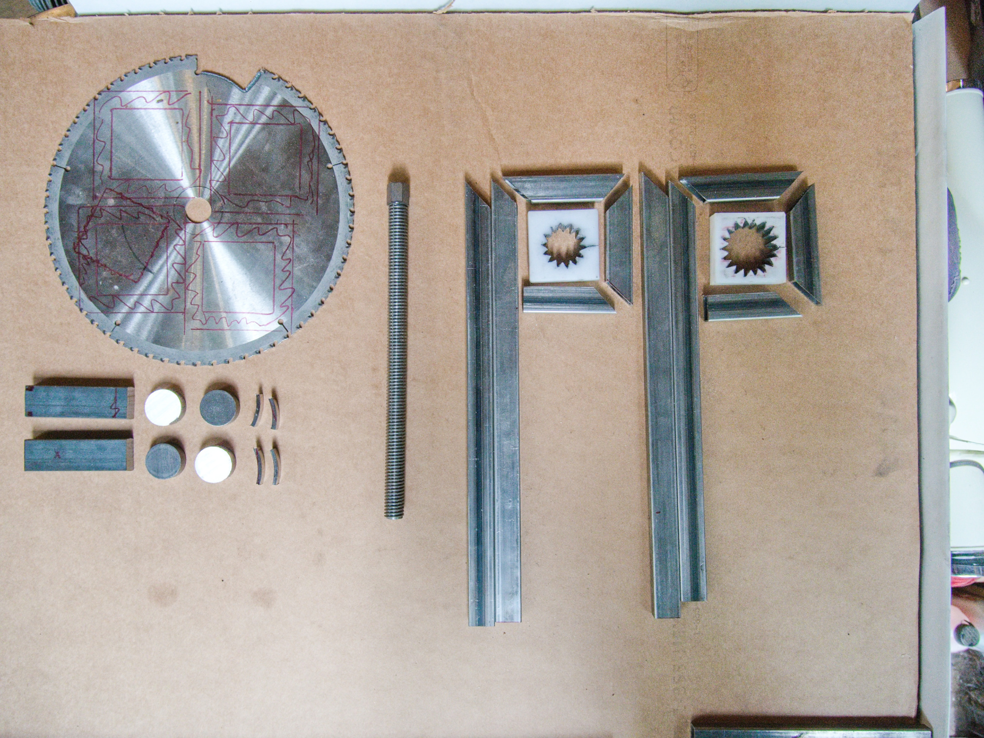 The square frames were cut out from a saw blade for additional strength using a plasma cutter.