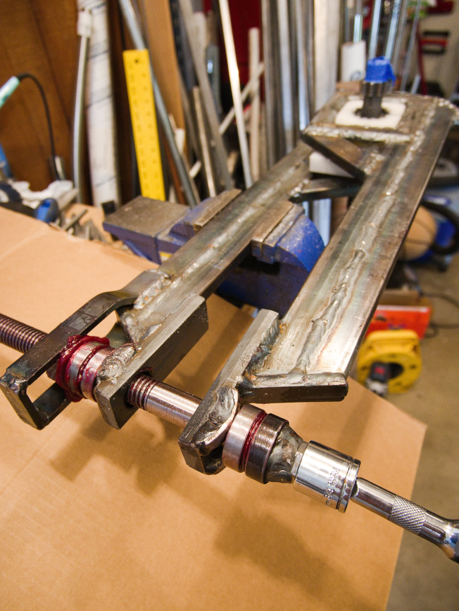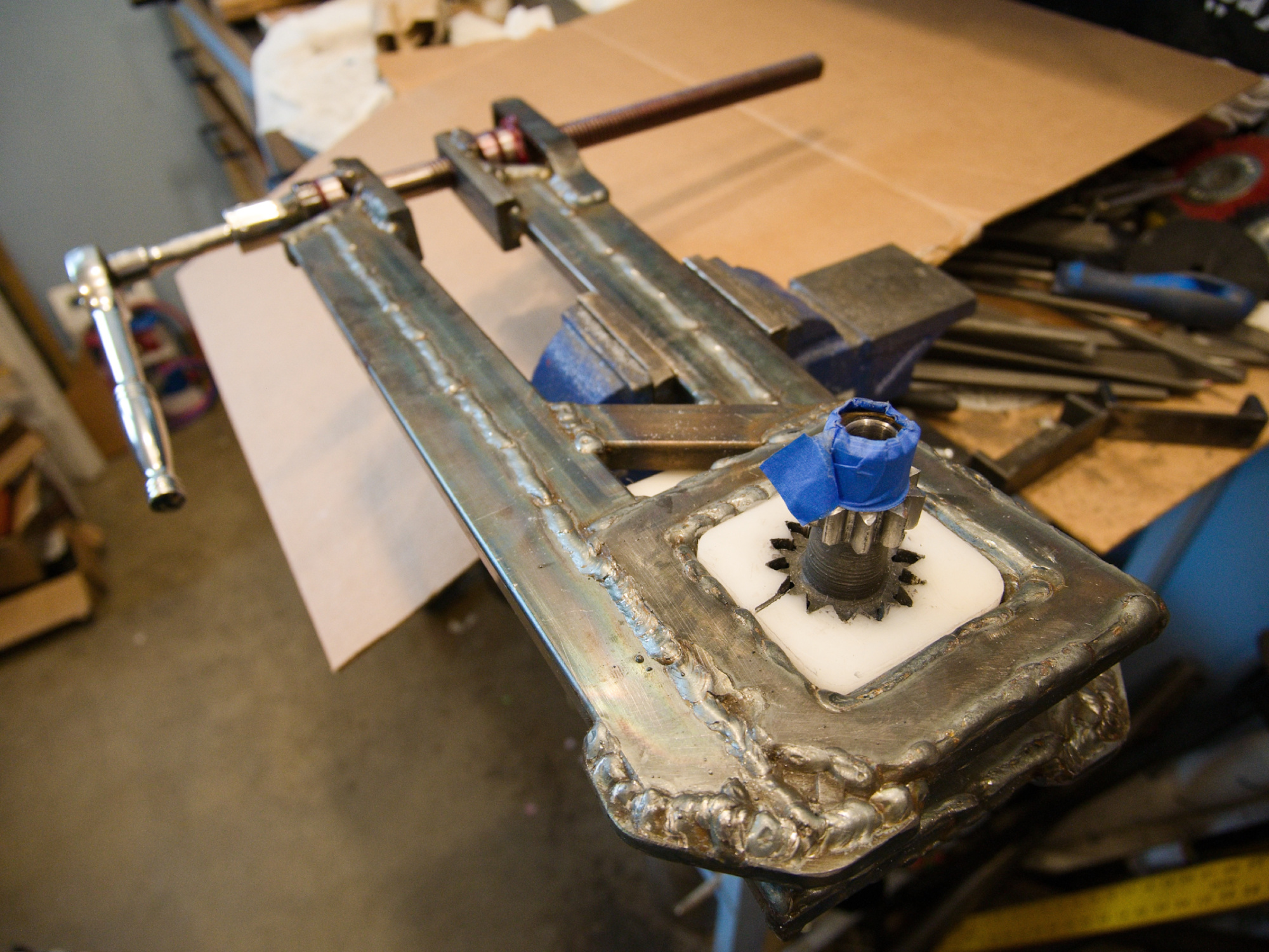I fabricated two square holders that are connected with a 3/4" acme threaded rod to twist the gears. I made sure there would no breaking this time, and as it turned out, the aligning of the gears using the screw was easy.