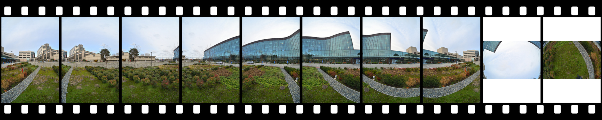I took this panorama about an hour before sunset without a tripod while waiting at the main exit. The main challenge was aligning the pathway with the building's geometric facade.