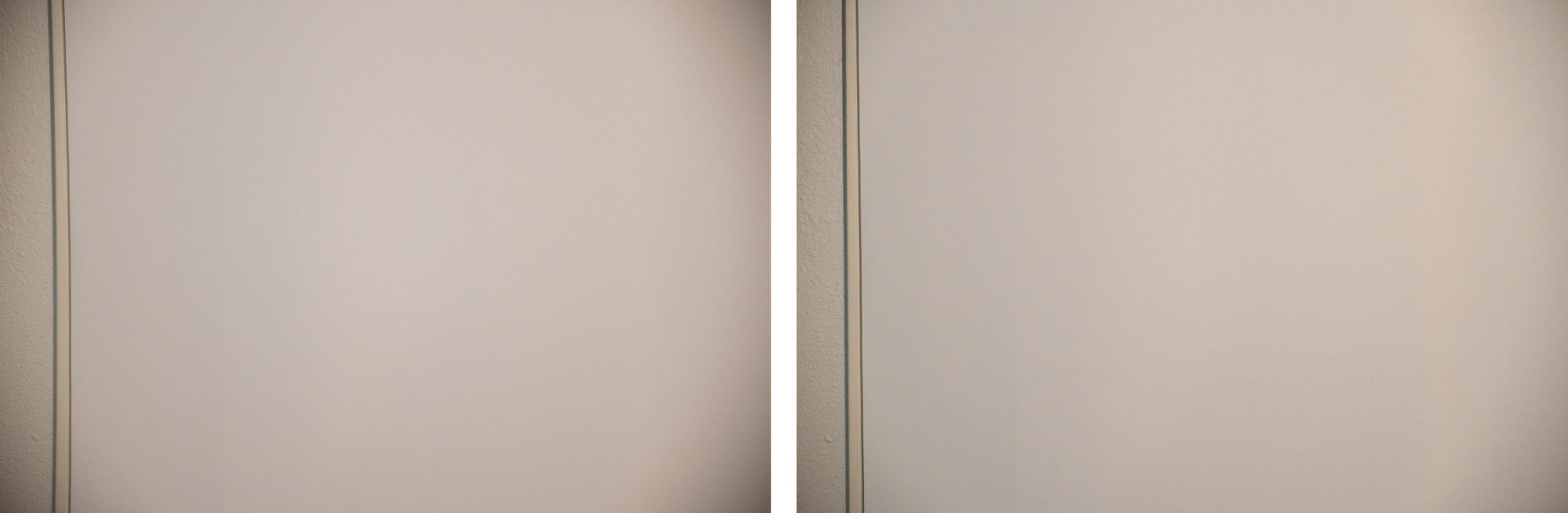 Observe the heavy vignetting at 50mm f/2.8, along with the visible distortion. Zoom in and it disappears. Left side is without correction, right side with correction using NX Studio.