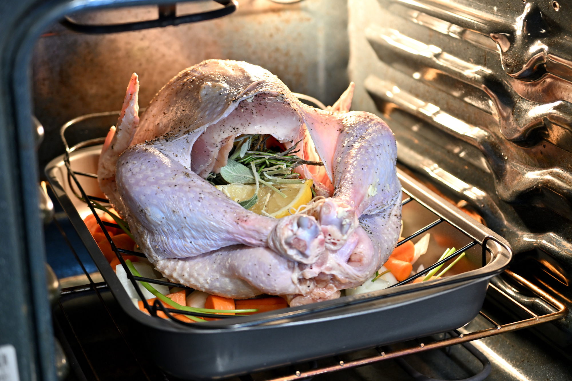 Focused manually because autofocus would have locked on the oven glass instead of the turkey inside.