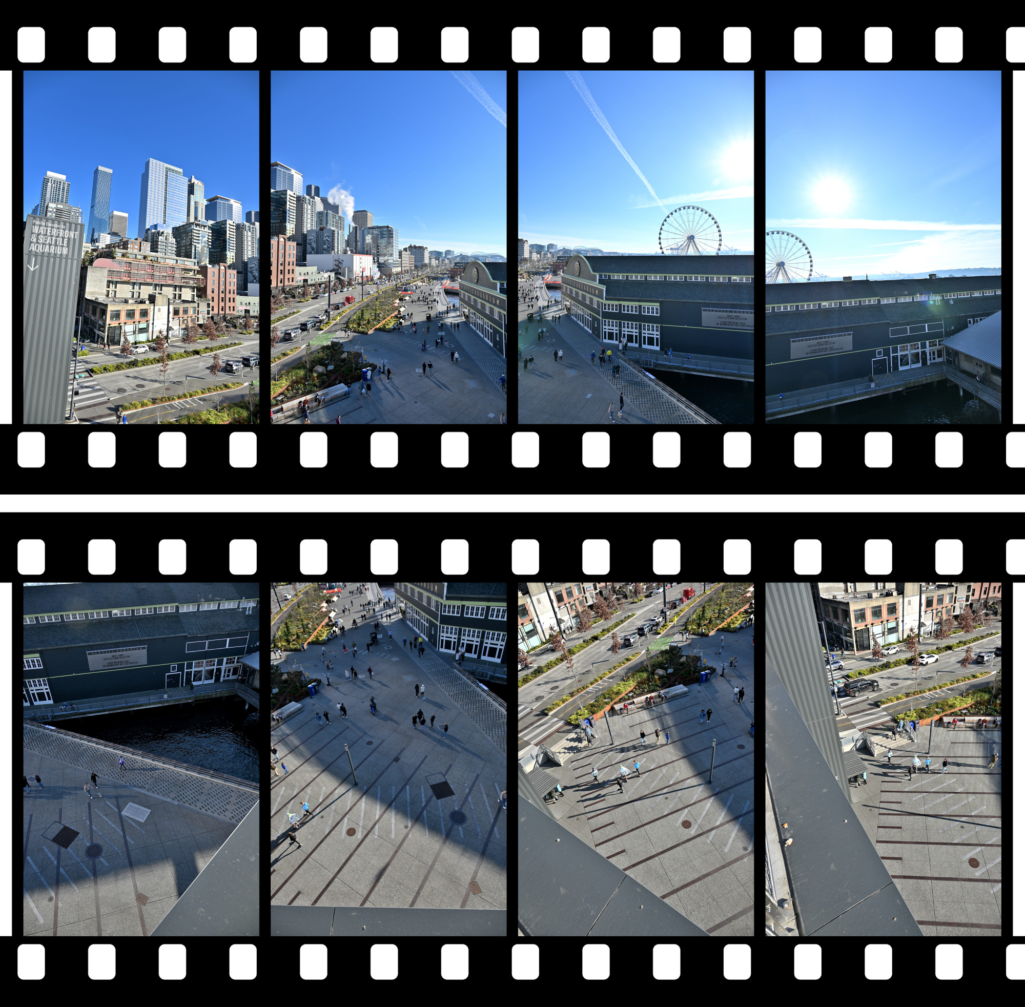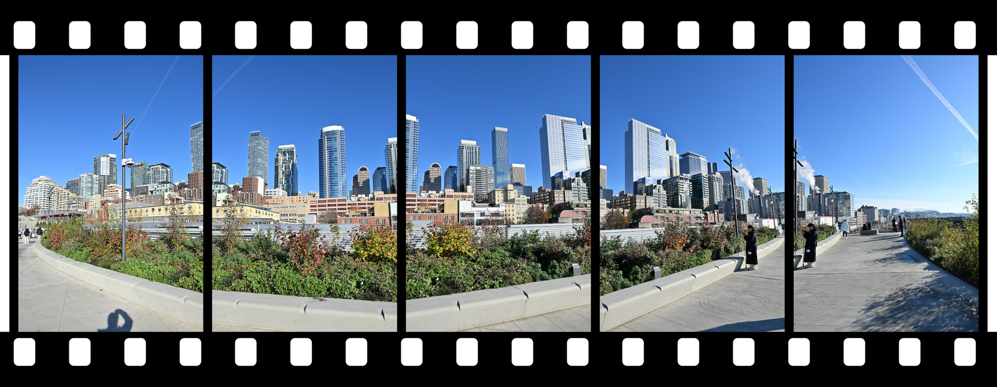From the Overlook Walk, the view opened wide. The waterfront stretched below, ferries tracing slow lines across the bay, and behind it all the skyline stood still against the pale sky. The skyline panorama frames capture the city in one continuous sweep, holding its full breadth in a single image.