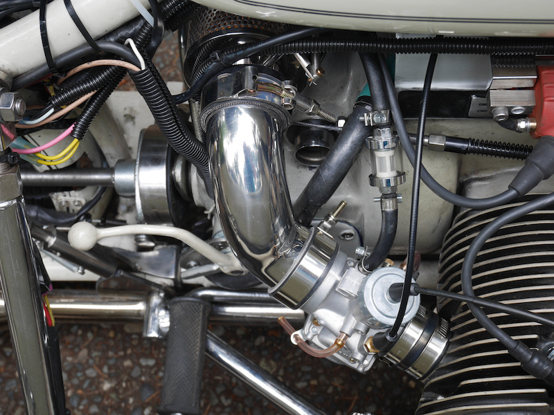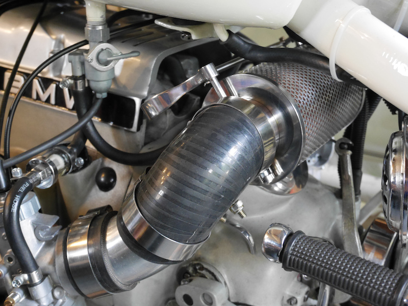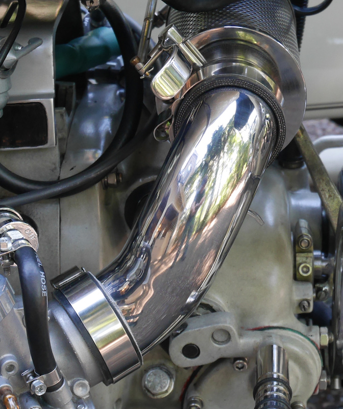 With the custom air filter and new carbs, the standard intake pipes do not fit and the aluminum - rubber combination looked ugly.