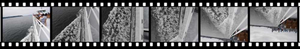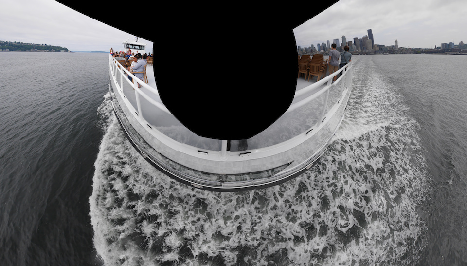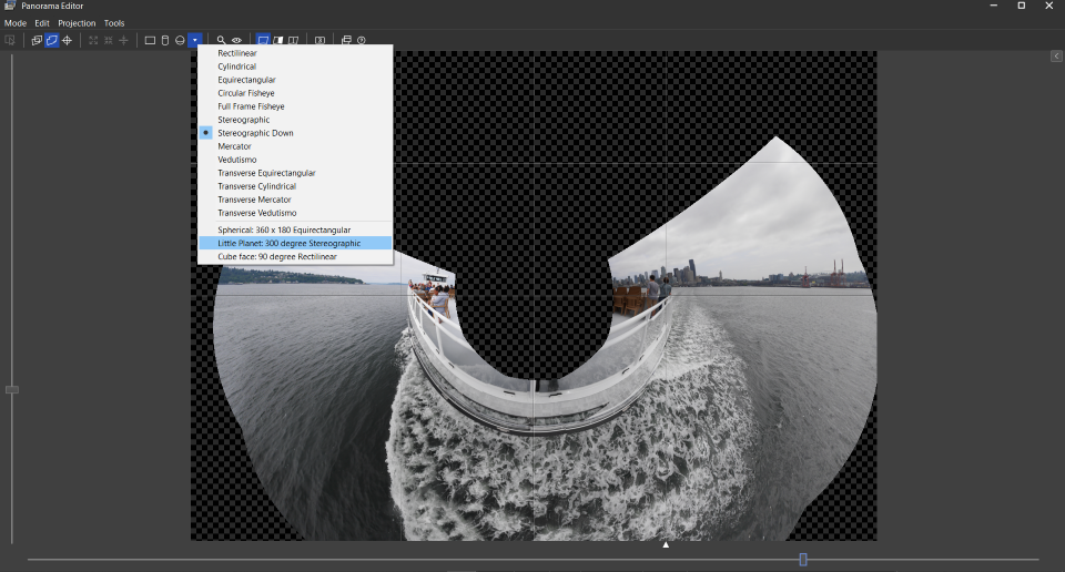 The 300° stereographic down projection is also known as the little planet projection. Usually it is used to transform a 360°×180° into those famous little planets, but in this example it is applied on a vertical 180° panorama with the last photo upside down: