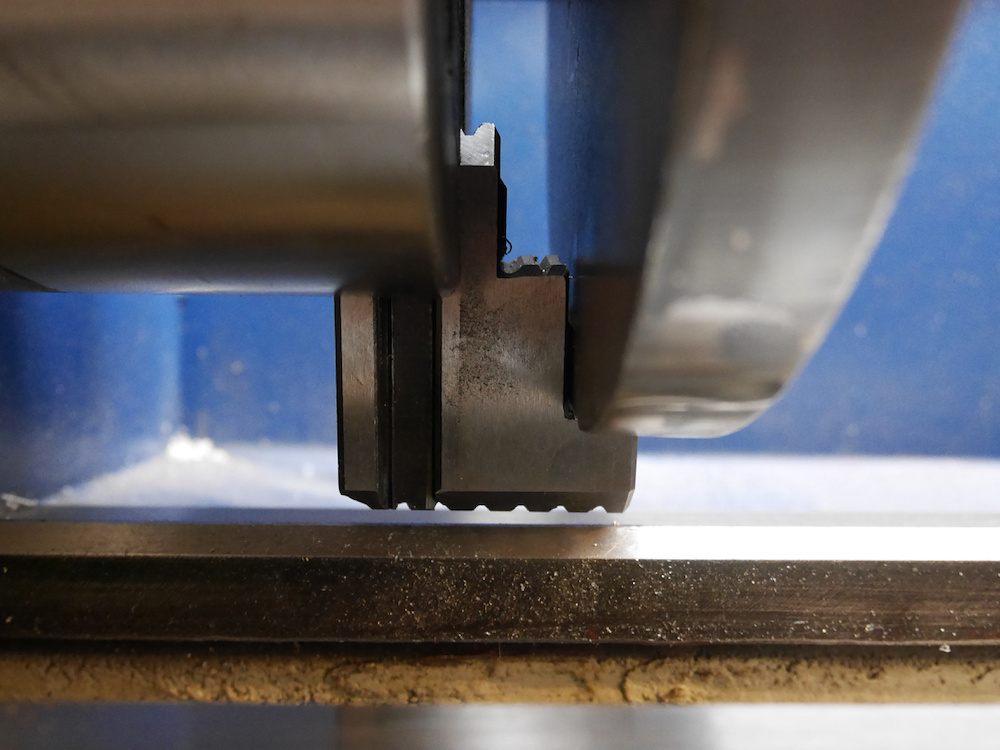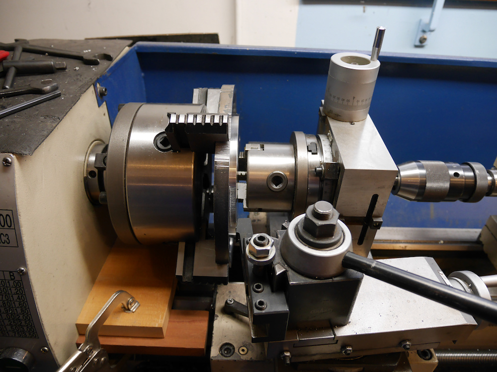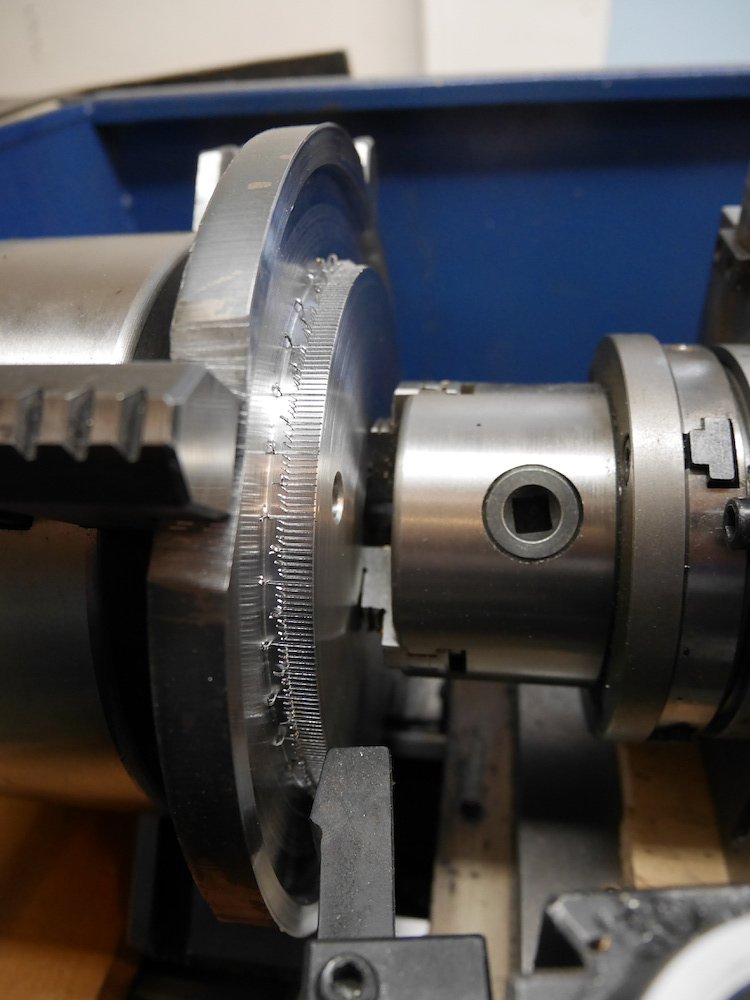 This setup is for the engraving. With a insert for cutting threads, the degree ticks were done. A simple wood block ensured a constant length of the tick marks. Once done, the 5 and 10 degree marks were done with a slightly larger depth.